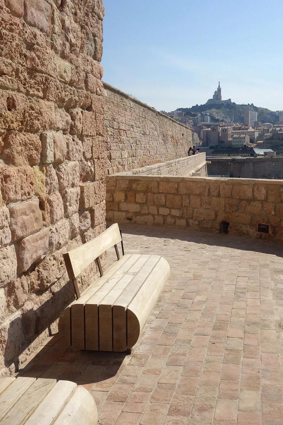Canebière和Auffes花園位于防御工事景區下半部分空間的陸地上,享有絕佳的景觀視野,置身于其中,游客們不僅可以看到防御工事景區中充滿歷史感的森林,還可以俯瞰馬賽城市和Canebière大街的景觀。此外,花園中的一條步道還將狹窄的樓梯與山頂露臺連接在了一起。來到山頂露臺,游客們不僅可以遠眺欣賞到整個城市的絕妙景色,更可以回望欣賞整個Fort Saint Jean防御工事景區的全貌。