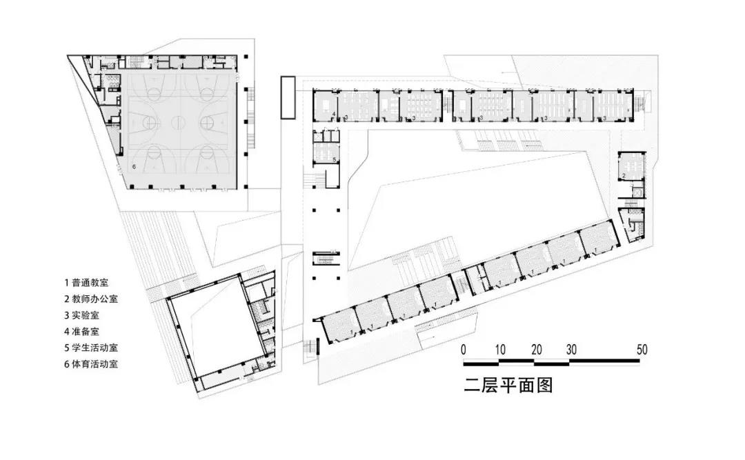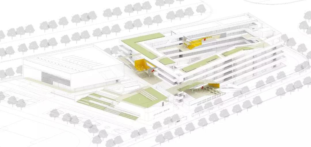 我們在教學樓每層的不同部位設置了半室外的多功能共享空間,并通過變化的路徑將其串聯,實現了不同室外空間的滲透,打破了教學樓層與層之間的界限,形成了貫穿建筑的立體環繞路徑。