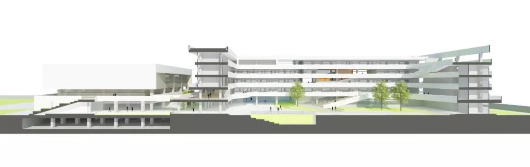 教學辦公綜合樓南北側教學組團與東西側辦公組團圍合形成的中央內庭院,是整個建筑中最活躍也是最重要的景觀節點,其通過教學樓西側平臺下的灰空間與運動場相連,更是在建筑一層形成開敞連續的室外活動場所。