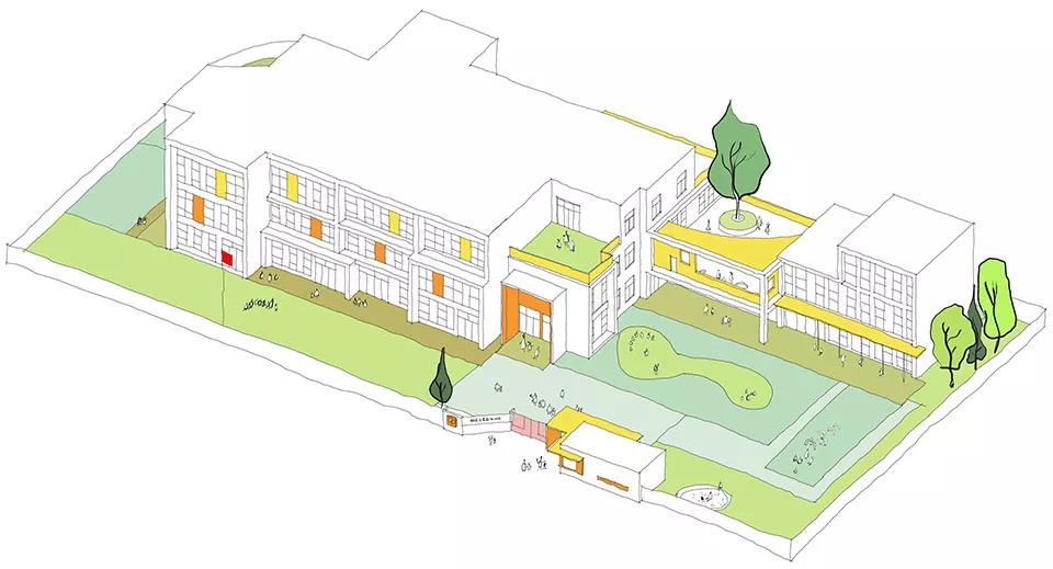 原建筑是由一棟主樓和輔樓組成,建筑嚴肅與住宅相識,我們希望建筑本身可以激發孩子的幻想,和自由意識。因建筑整體無法做大動作的調整,通過“插件”的這個設想的動作,來完成整個建筑上的情感暗示。新的插件語言通過控制性的顏色模糊了實體屬性,讓孩子可以體驗建筑本身,同時提示著幼兒園在街道的位置。