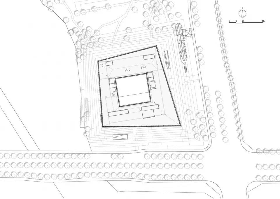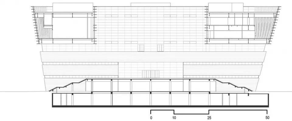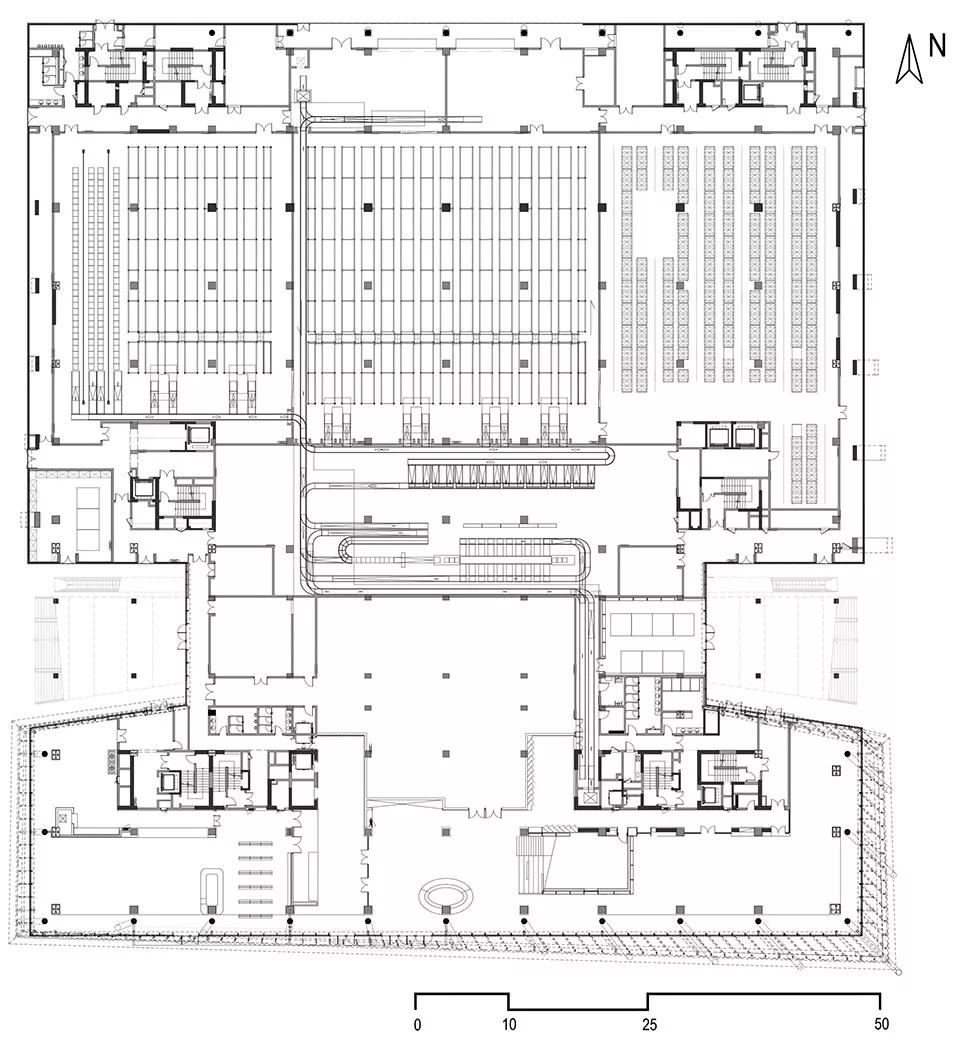 兩部分建筑體量,被建筑東西方向軸線上的公共廣場分隔開,圖書館主入口也位于這個被抬高的廣場兩側,可經由大臺階到達廣場,進入圖書館南北兩區,同時可由廣場到達書香公園。通過提供穿越場地的捷徑,引導眾多市民進入這兩部分建筑,建立了建筑內外空間的功能性連接,將圖書館及其多元化的文化活動,整合到城市結構中。