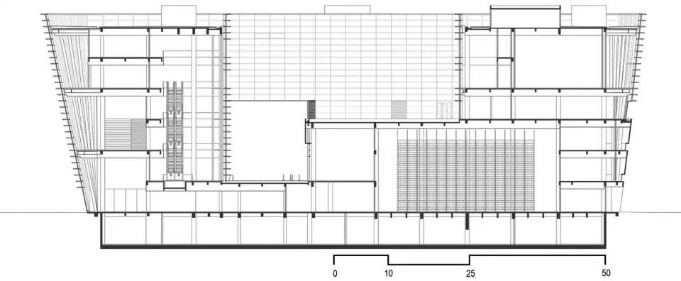 根據公共空間與書庫的不同使用要求,圖書館建筑被分為兩部分,它們在基座與上層空間中相互連接。書庫部分厚實的外墻設計采用水平線條木紋肌理的清水混凝土,與通透的玻璃幕墻包裹的公共區域相互交疊。立面較為封閉的智能書庫位于地塊北側,而采用通透立面設計的閱覽室則位于南側,朝向城市景觀。地上六層建筑層高均為5.7米。