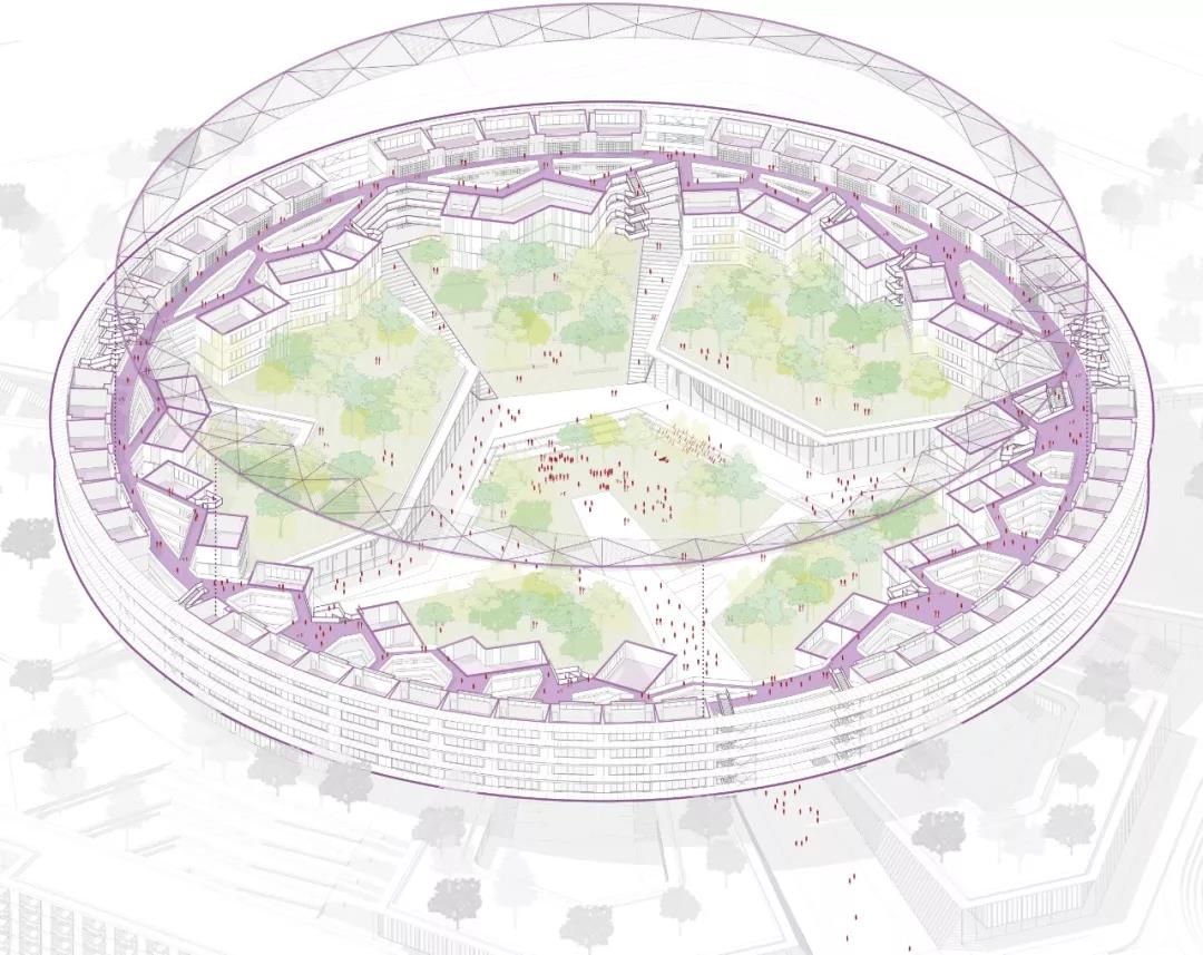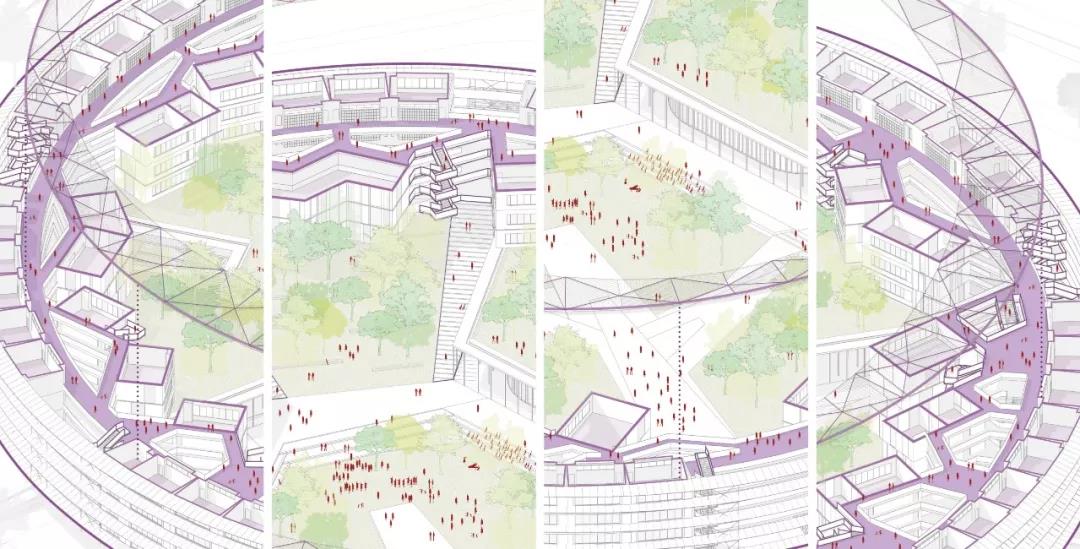 傳統的校園中,自然與教育像是兩個獨立的系統,天然的被阻隔,而建筑師希望將自然引入校園。環形教學樓外是如同森林的狀態,隔離城市的喧囂,環內設置中心花園,疊落起伏,同時充分確保內外的通透與關聯。