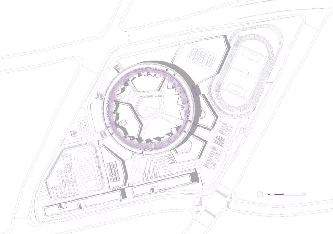 本部的校園教學樓呈現圍繞操場布局的狀態,經推敲得出這種布局之下的校園空間尺度更為充裕,設計之中也在延續南開中學本部的空間邏輯。然而基地范圍內,高差、噪音、用地范圍均構成了設計的限制因素。在綜合考慮空間效率的同時,南開中學校園文化中開放、進取的精神也無一不在影響著對中學設計的考量。