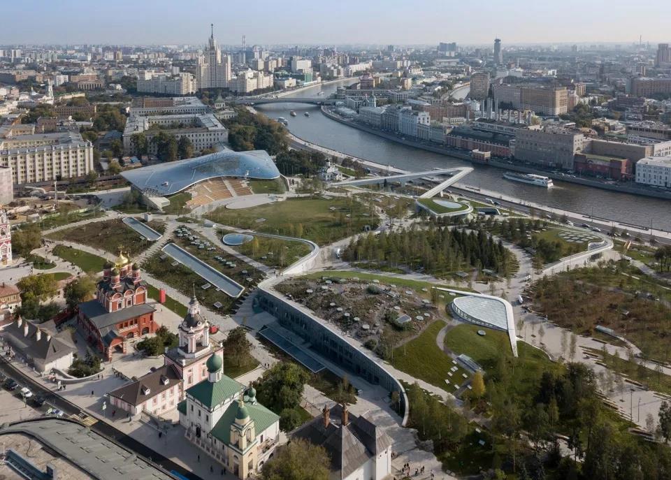 扎里亞季耶公園位于莫斯科的中心位置,毗鄰圣巴西爾大教堂、紅場和克里姆林宮,歷史悠久的場地展現(xiàn)著俄羅斯的集體記憶以及對未來發(fā)展的希冀。這塊35英畝的土地在歷史上經(jīng)歷了多次重構(gòu):19世紀時成為猶太人的飛地;后來被用作斯大林風格摩天樓的基座;最后又成為了歐洲最大的酒店(俄羅斯飯店),直至2007年被拆除。在那之后的五年,這塊位于中心地帶的場地一直處于封閉狀態(tài),并打算擴展為一個新的商業(yè)中心(由諾曼·福斯特事務(wù)所擔任設(shè)計)。
