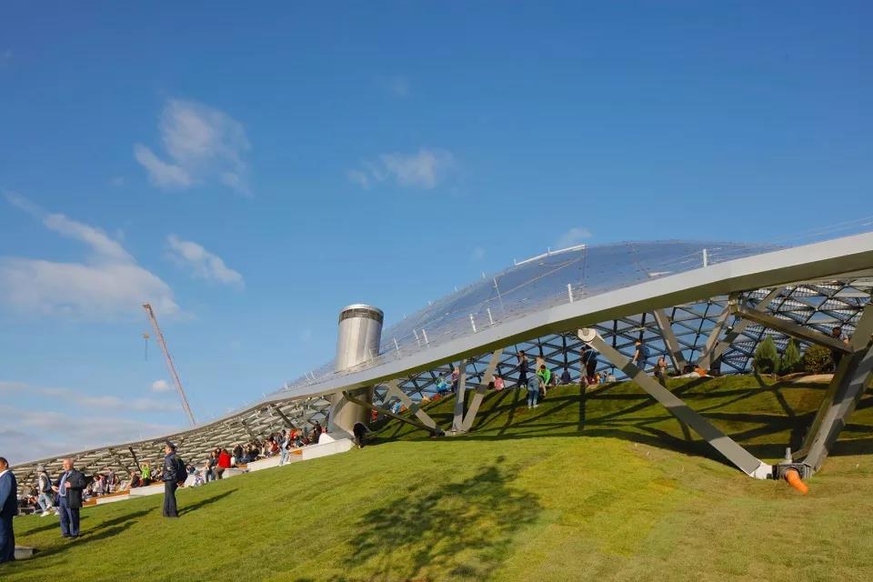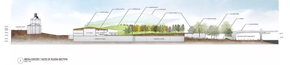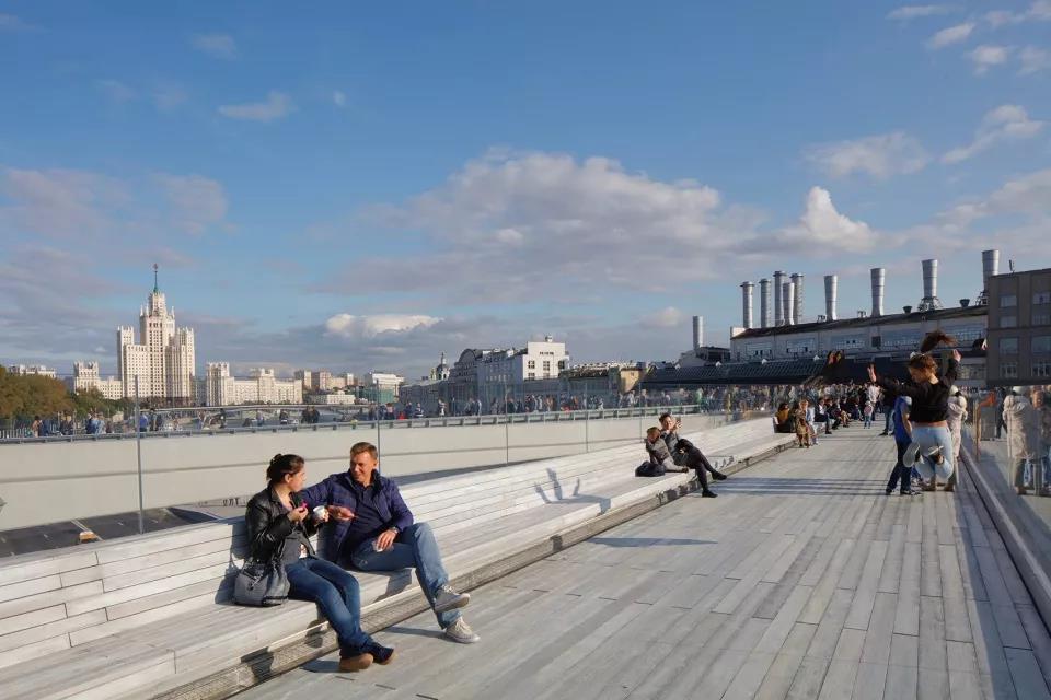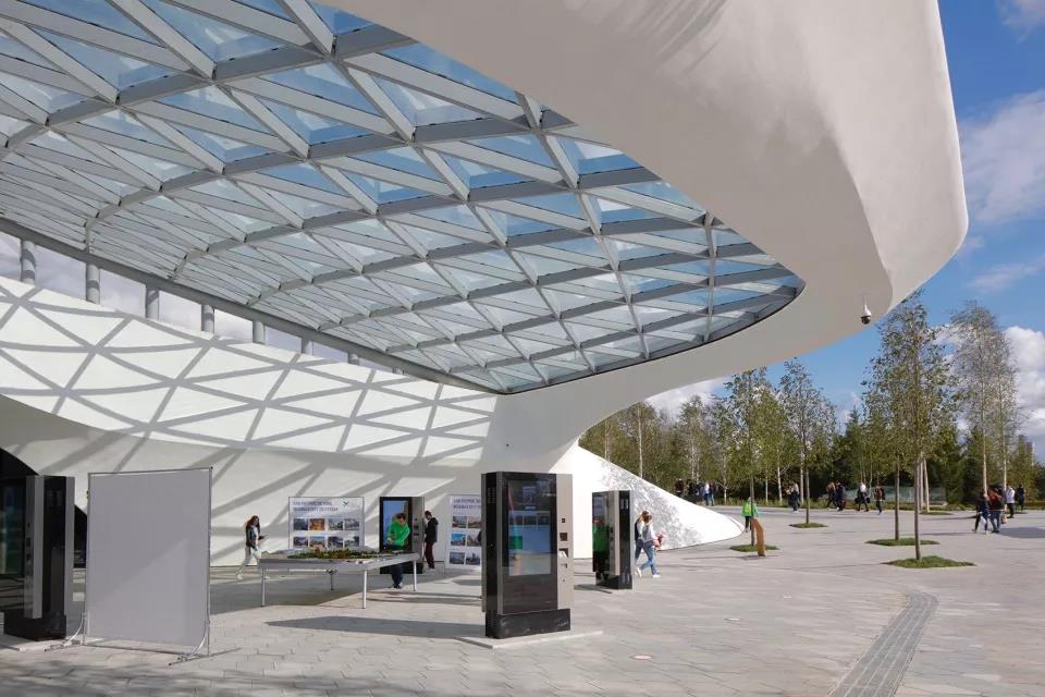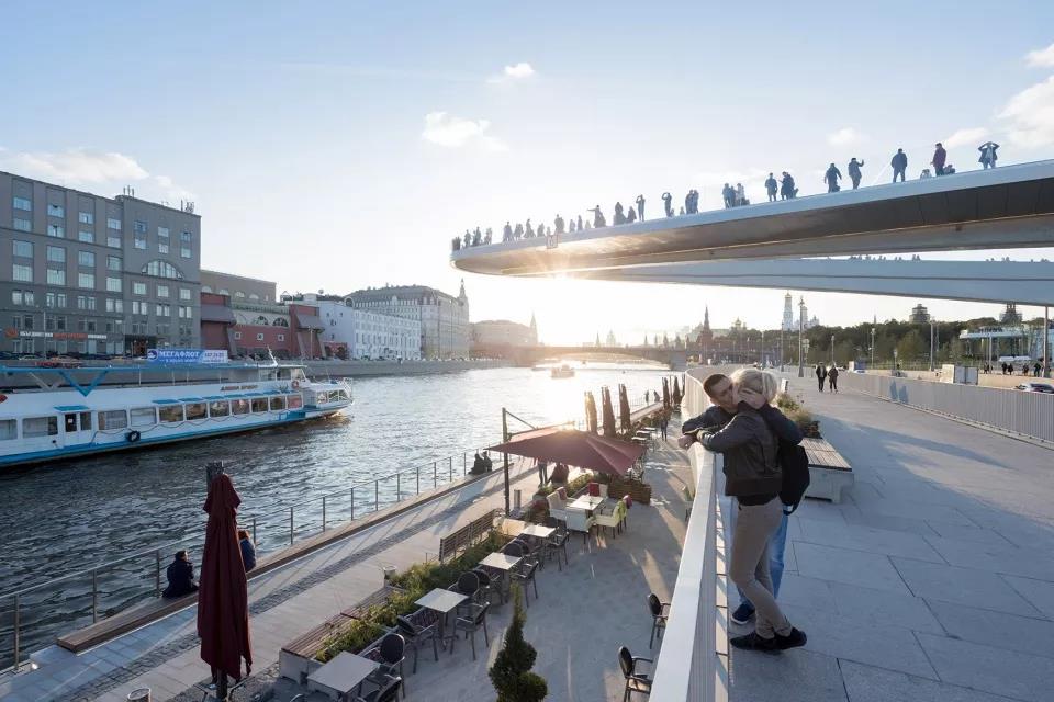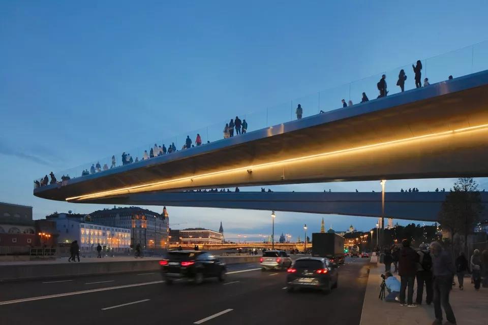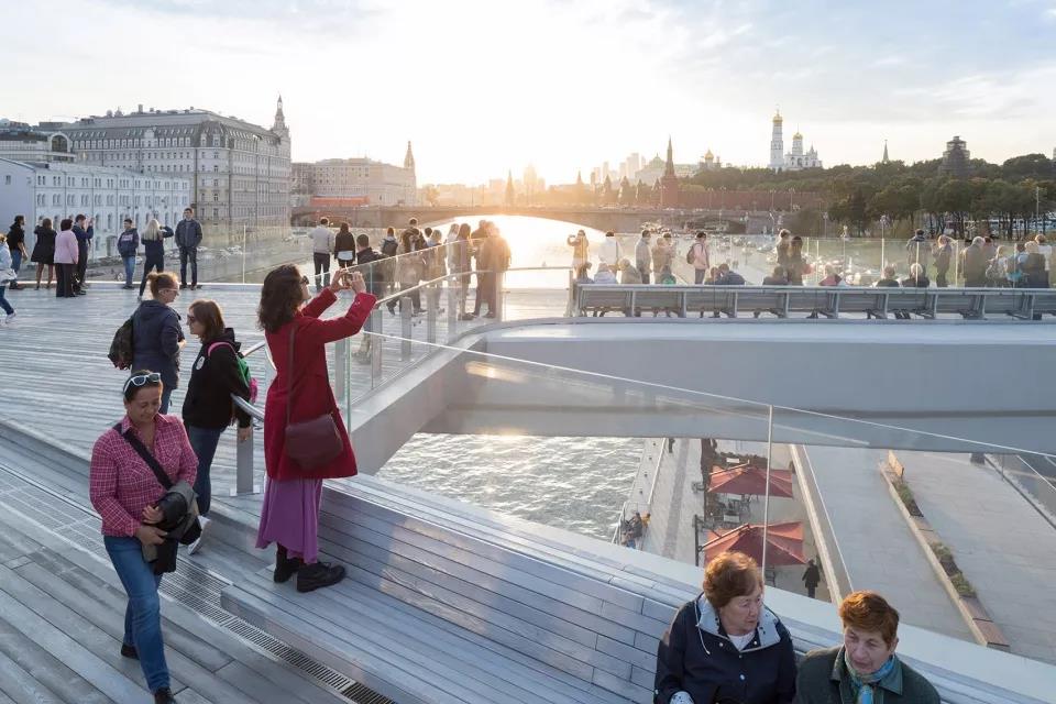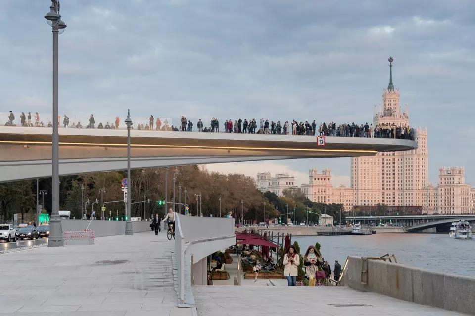游客們可以站在長達70米的懸臂結(jié)構(gòu)上俯瞰莫斯科河,同時將媒體中心、自然中心、餐廳、市場、兩個露天劇場和愛樂音樂廳收入眼底。