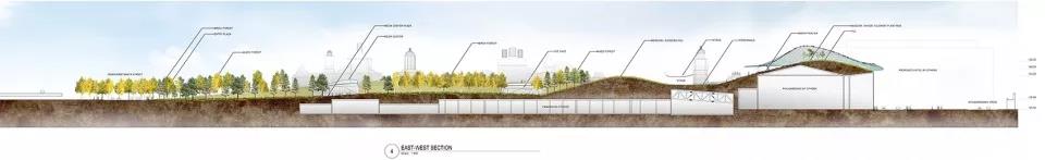 剖面上的交錯還有利于改善微氣候,以延長持續(xù)時間較短的溫暖季節(jié)。被動式的氣候控制策略包括調(diào)節(jié)景觀山丘的形態(tài)以及露天劇場的玻璃外殼,以形成溫暖空氣的自然流動。最終的結(jié)果是,該策略有效降低了風量,延長了植物的綠期,同時,隨著游客走上斜坡,環(huán)境溫度也會逐漸提升。