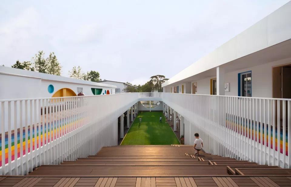 最初的場地由兩棟危房和幾片空地湊成,多年以前是作為茶室使用。兩棟建筑之間的中庭空間狹小、砂石散亂,墻角的泥濘和青苔相浸。兩棟舊房之間的空間并不大,而戶外空間與中庭相互隔斷,沒有一個地方能夠充分滿足孩子的追逐嬉戲。即使把現有的室外場地全部使用,似乎也不盡興。茶室意味著某種退休之后的閑暇休憩的靜態空間;而幼兒園,則暗示著不斷生長的動態環境。在這個矛盾的前提下,ZAN工作室的建筑師重新梳理了空間的路徑,并充分考慮了兒童身體的感知體驗:在中庭空間設計了一個開放階梯,連接起一層開放的綠地空間和二層的環形平臺。而在中庭和外部空地之間,一道彩虹門打通內外的活動空間。