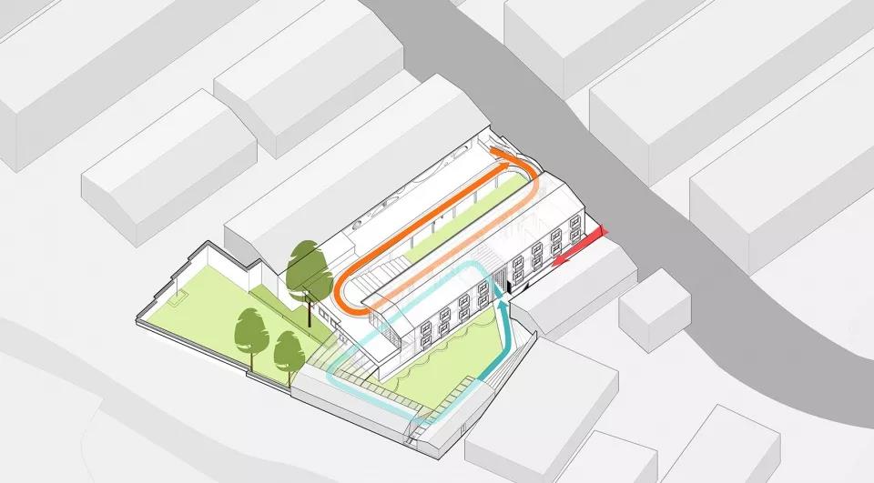 這是一個意義深遠的設計策略,它直面了場地有限的開放空間和兒童游戲的天性之間的矛盾。恰如在城市中,要想讓大多數居民舒適并且擁有足夠的空間,“高密度”是唯一的選擇。這處幼兒園的設計,也創造出兩個不同標高的游戲場地,在極其限制的空間局面內,形成了“一層內外庭院+二層開放回路”的復雜格局。多層次、多回路的空間增加了基于兒童行為學特征的探索體驗。孩子們嬉戲追逐、歡樂探險,用稚嫩的腳步丈量童年的歡樂時光,在游戲中完成著自己的社會化人格。這些行為本身既是游戲,也是學習,不能用簡單的、規則化的空間去草率應對。