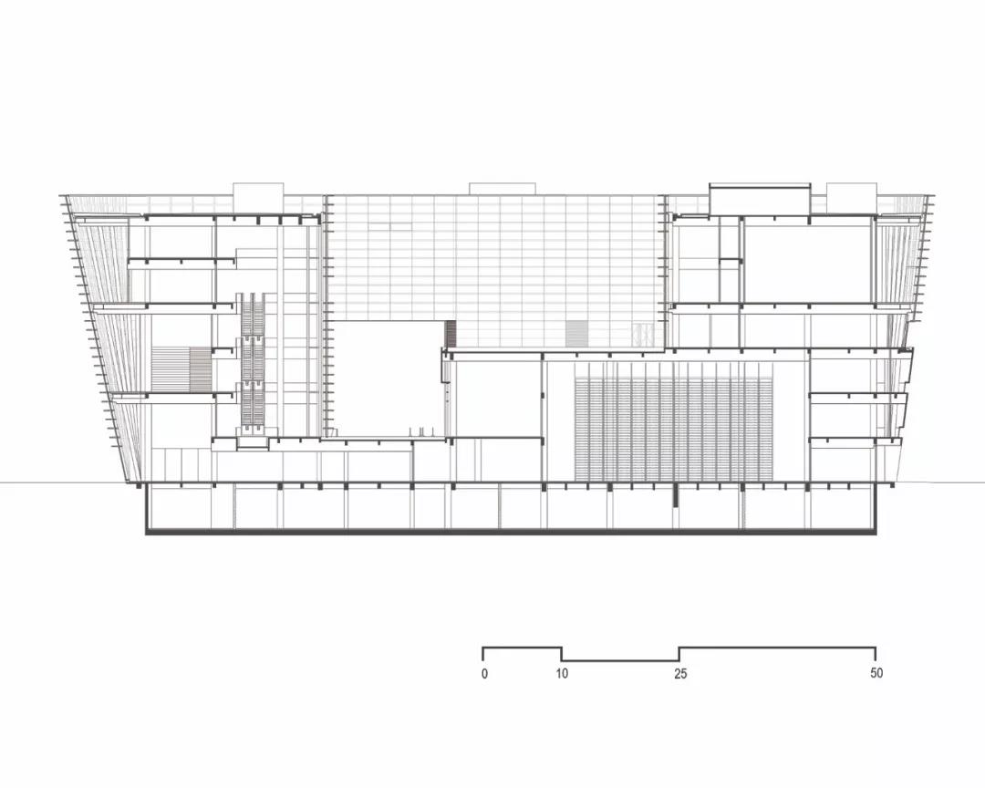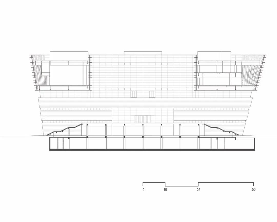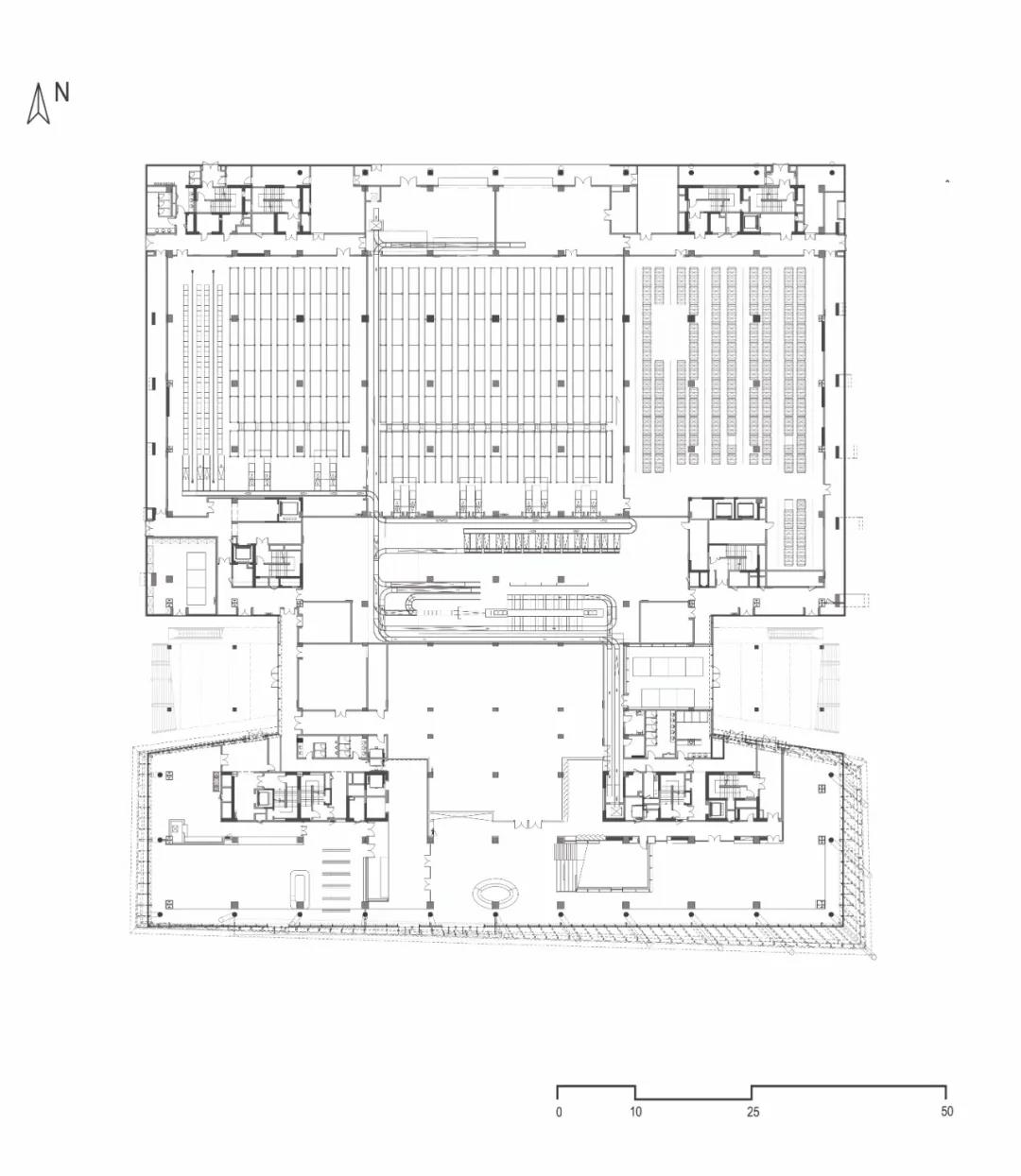 兩部分建筑體量,被建筑東西方向軸線上的公共廣場分隔開,圖書館主入口也位于這個被抬高的廣場兩側,可經由大臺階到達廣場,進入圖書館南北兩區,同時可由廣場到達書香公園。通過提供穿越場地的捷徑,引導眾多市民進入這兩部分建筑,建立了建筑內外空間的功能性連接,將圖書館及其多元化的文化活動,整合到城市結構中。