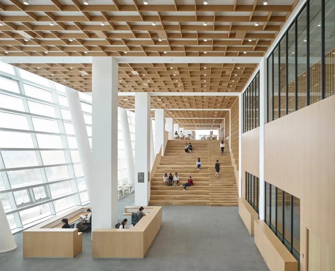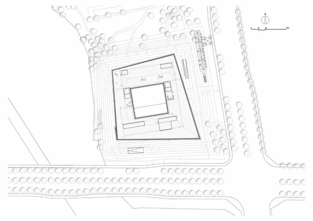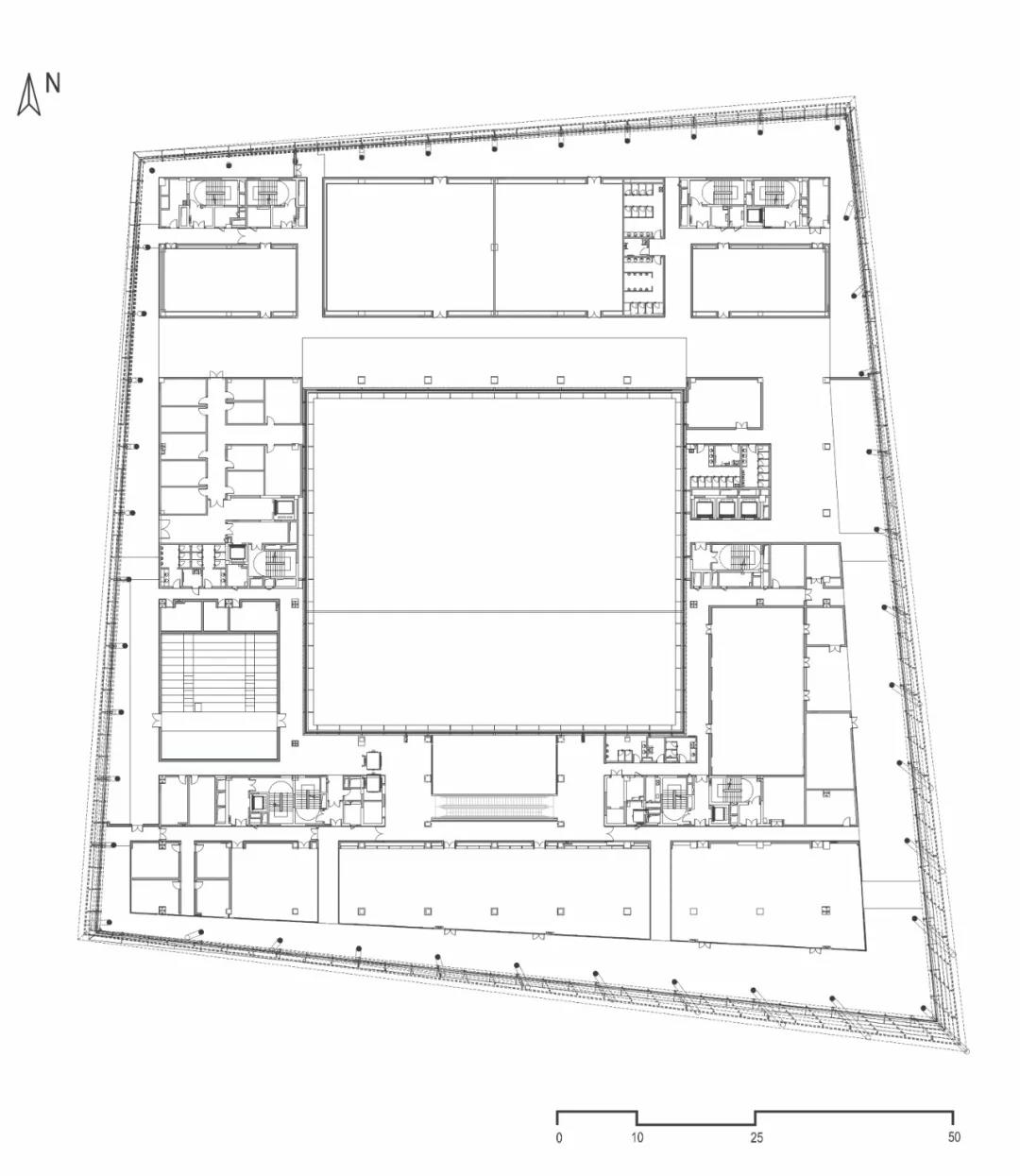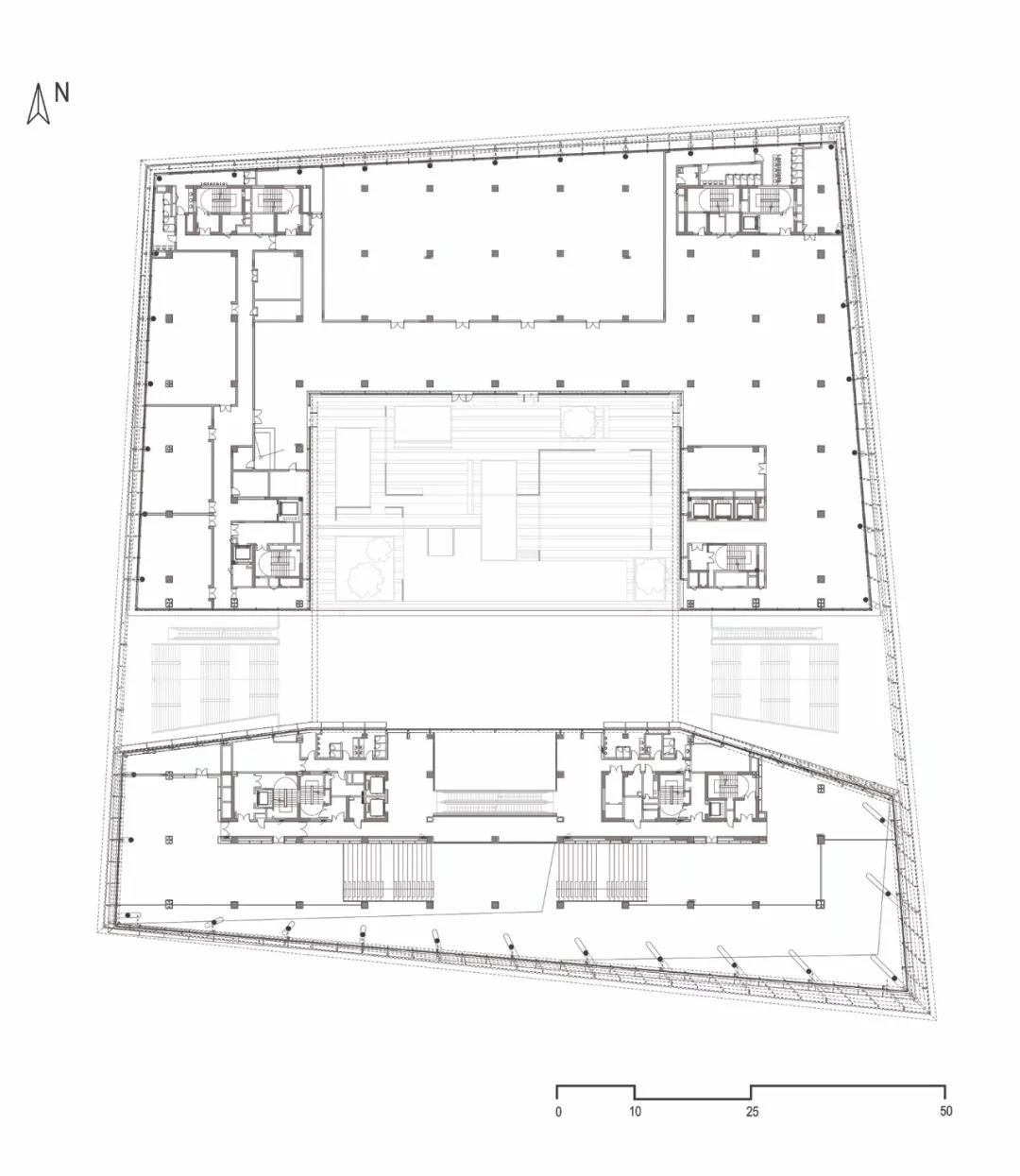兩部分建筑體量,被建筑東西方向軸線上的公共廣場分隔開,圖書館主入口也位于這個被抬高的廣場兩側,可經由大臺階到達廣場,進入圖書館南北兩區,同時可由廣場到達書香公園。通過提供穿越場地的捷徑,引導眾多市民進入這兩部分建筑,建立了建筑內外空間的功能性連接,將圖書館及其多元化的文化活動,整合到城市結構中。
