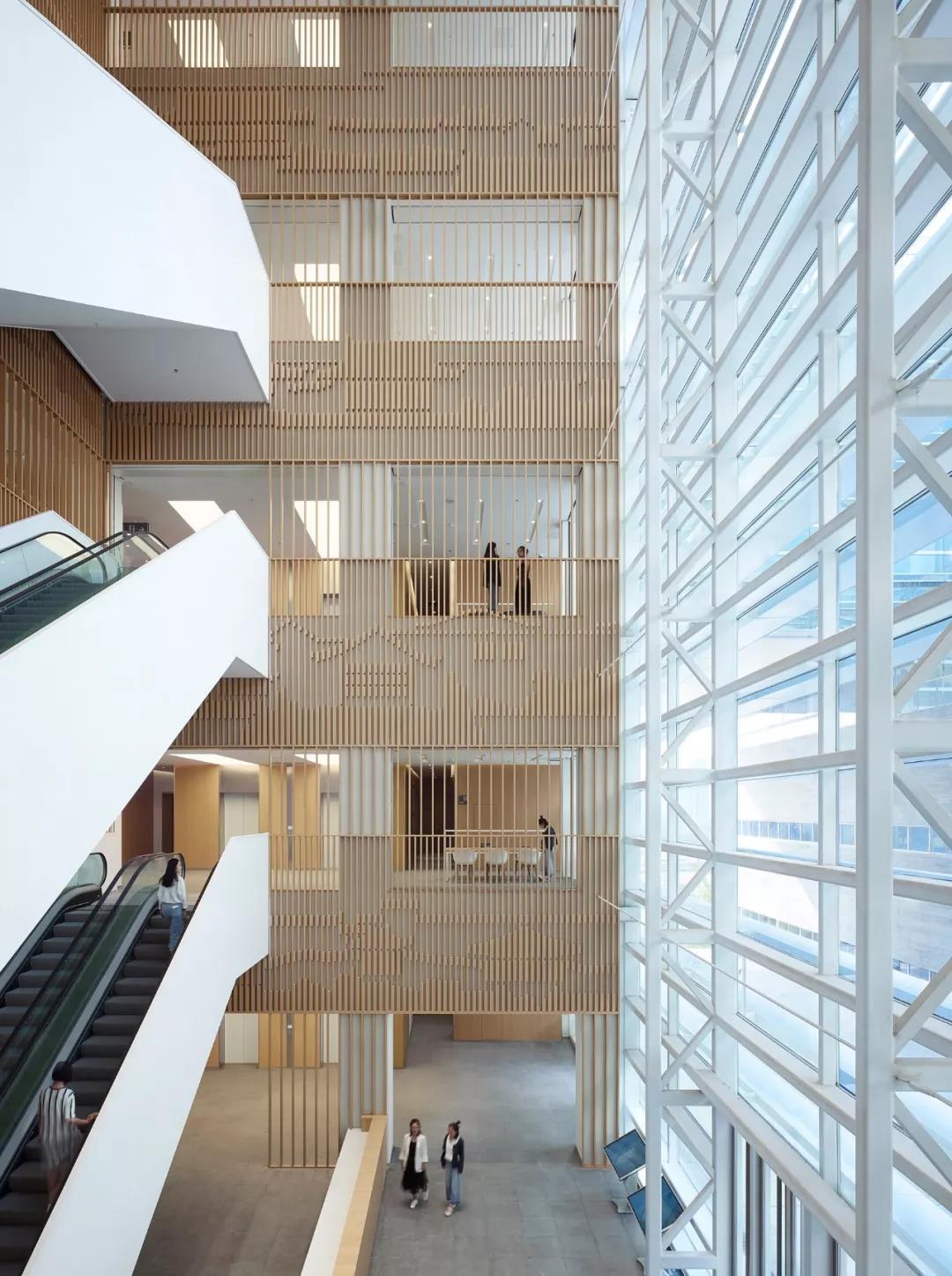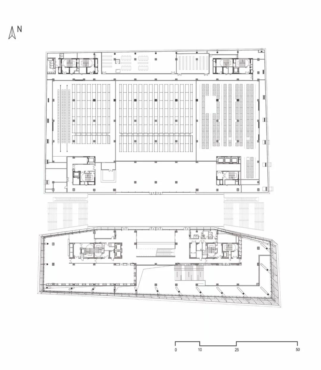 根據公共空間與書庫的不同使用要求,圖書館建筑被分為兩部分,它們在基座與上層空間中相互連接。書庫部分厚實的外墻設計采用水平線條木紋肌理的清水混凝土,與通透的玻璃幕墻包裹的公共區域相互交疊。立面較為封閉的智能書庫位于地塊北側,而采用通透立面設計的閱覽室則位于南側,朝向城市景觀。地上六層建筑層高均為5.7米。