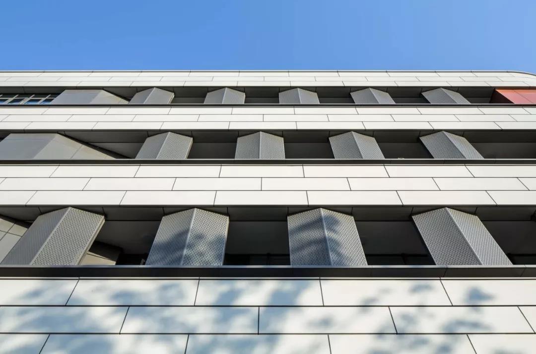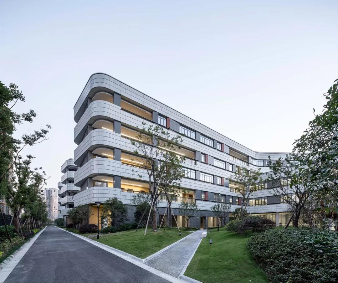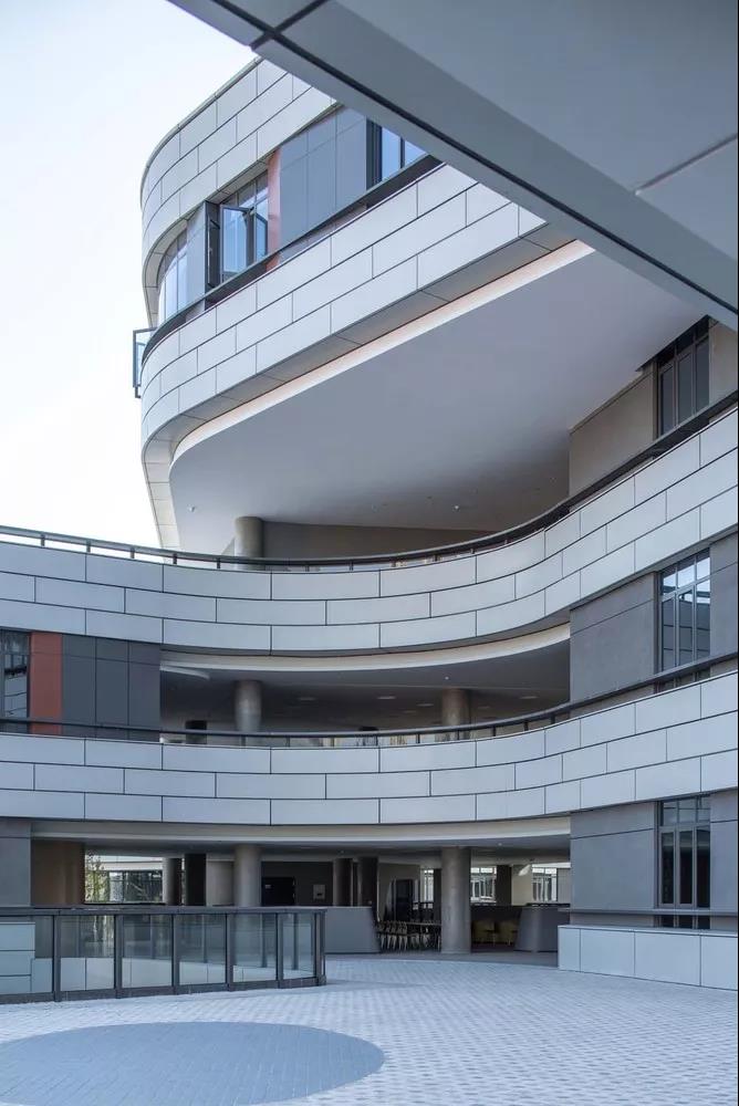 水墨淡彩,書聲瑯瑯。建筑主體采用連續環通的淺白灰色仿陶鋁板錯縫拼接,突顯整體水平流動感。外廊局部敞開,多角度灰色鋁板錯落層間,點綴些許紅色,為立面效果增添了韻律動感。