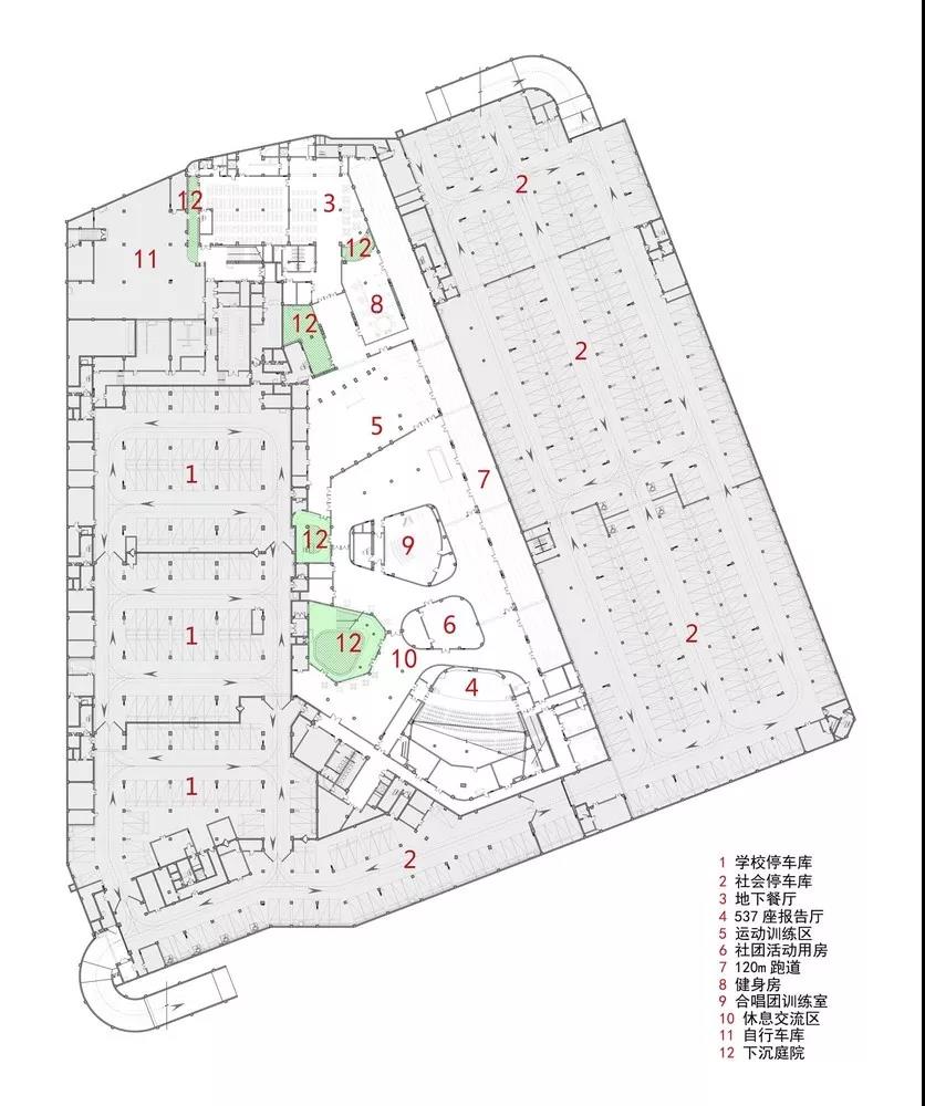 食堂、風雨操場、教師辦公等輔助活動空間的公共性最強,布置在校園南北兩端,交通便利并為核心教學區起到盾牌的作用。