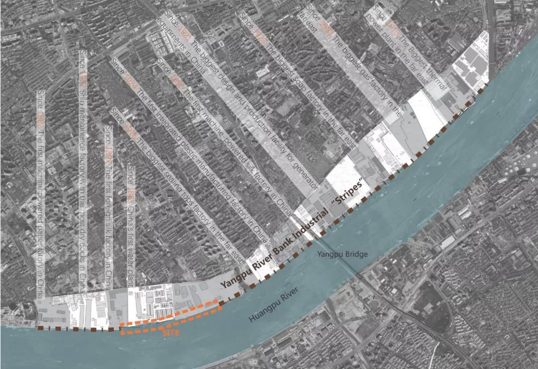 由于密集的廠區、單位割據江岸,建筑師作為多年生活在該區域的市民中的一員,從來不曾在楊浦區段接近濱水區域。“臨江不見江”是這一區域近百年來的城市空間難題。第一次經過重重障礙步入場地,站在老碼頭上,摸著滿是印痕的栓錨樁,眺望遠處陸家嘴金融中心。我們意識到這將是城市空間的一次重要的蛻變,也將是這個城市百年工業文化歷程鮮活呈現的重大契機。