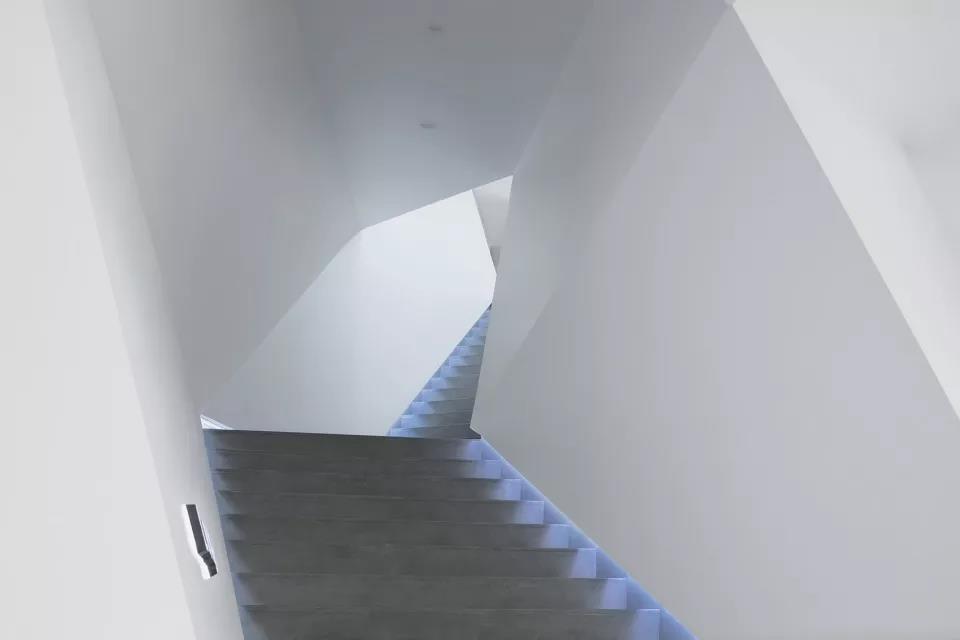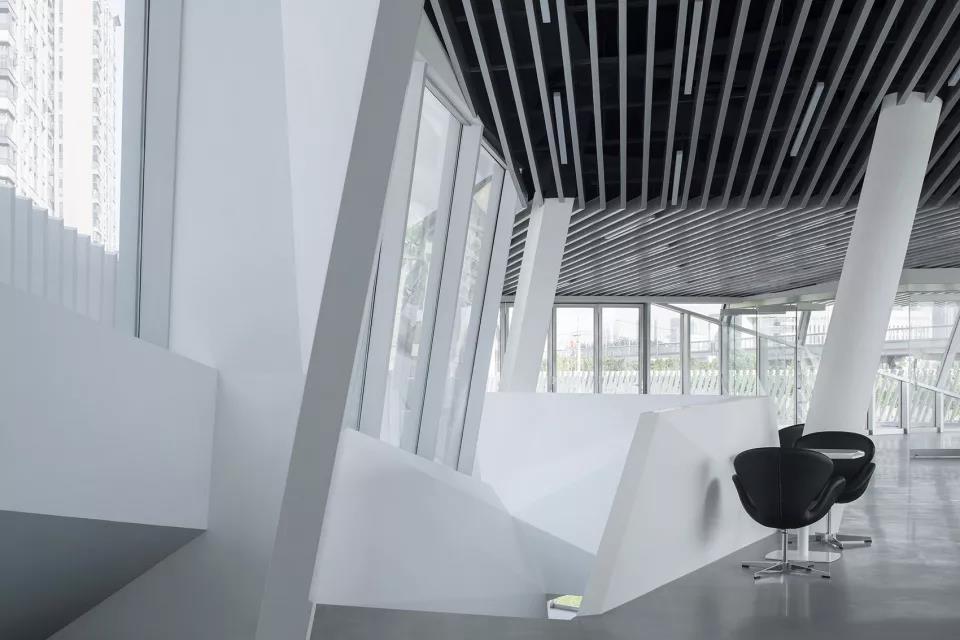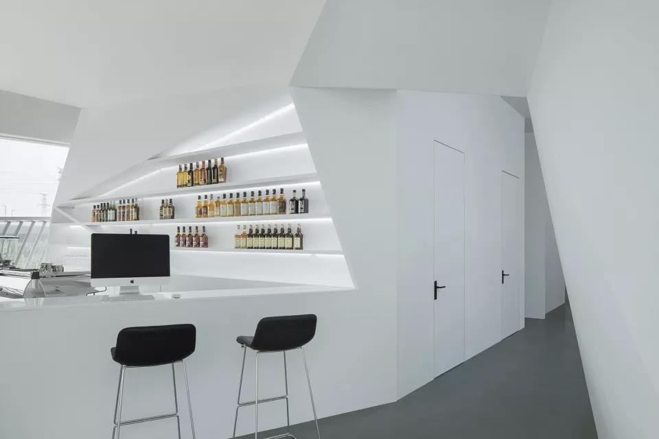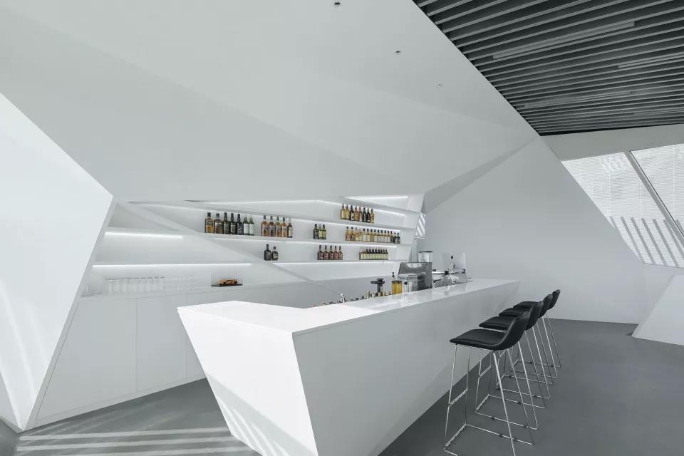 室內由連續轉折三角面包裹的室內樓梯將來訪者引領通往二層VIP休息區,二層室內延續了樓梯設計語言,由三角形轉折面組成的室內墻面兼具了裝飾性和吧臺收納功能。在二層末端的是管理人員辦公區,連續表皮在此處的轉換為辦公空間提供了足夠的采光以及良好的視野,將視線引向附近的開闊空間和綠地。同時,由體塊錯動而創造出的二層室外平臺為為來訪者提供可以一覽周邊景觀的觀景平臺,也為新車發布和品車酒會等活動提供了擴展的可能性。
