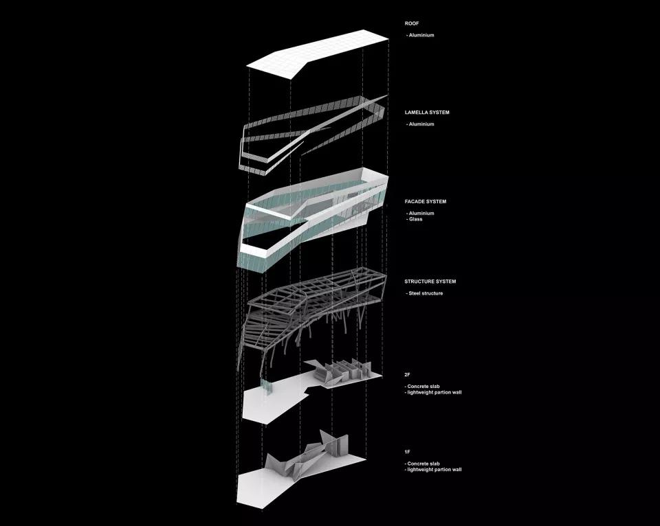 建筑師從蘭博基尼超跑硬朗的線條和激昂的棱角出發,將場地限制轉化為優勢,利用平行四邊形和三角形語言創造了一個適應于場地的全新建筑。建筑利用一系列旋轉上升的連續表皮圍合出整個建筑空間,連續的開窗使得來訪者在建筑的內部隨時可以與室外進行對話,來訪者在建筑中行走就像駕駛著一架特別的“超級跑車”,可以隨時關注內部空間和外部景觀的變化。為了消解體量壓迫感,建筑師設計并沒有將兩層體量滿鋪來與環境抗衡或是被動的避讓周邊建筑,而是通過兩層之間的錯動在通道的基礎上在和北側建筑之間創造了一個視線通廊,優雅的提醒到訪者新建筑的存在。