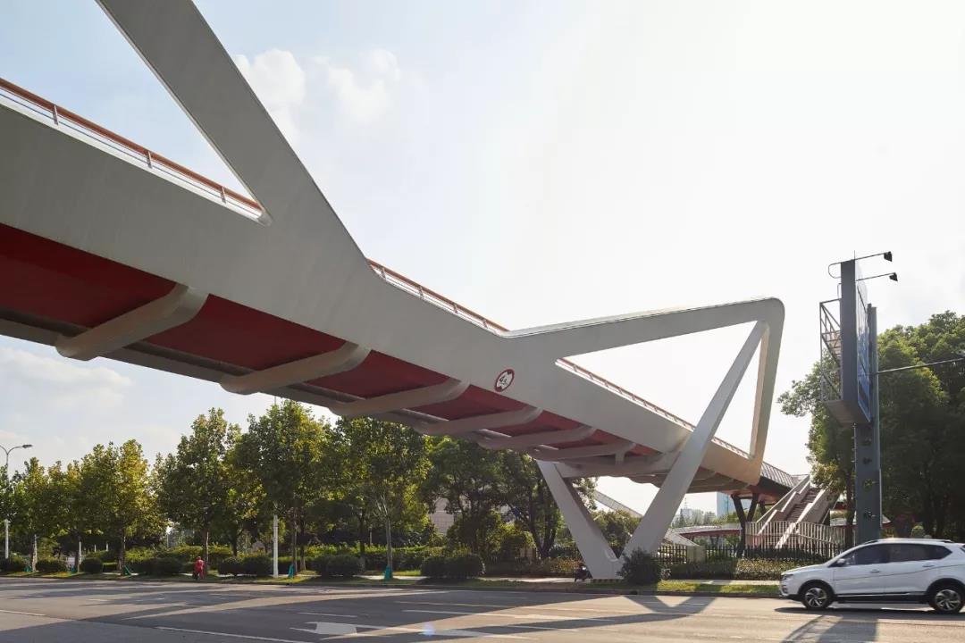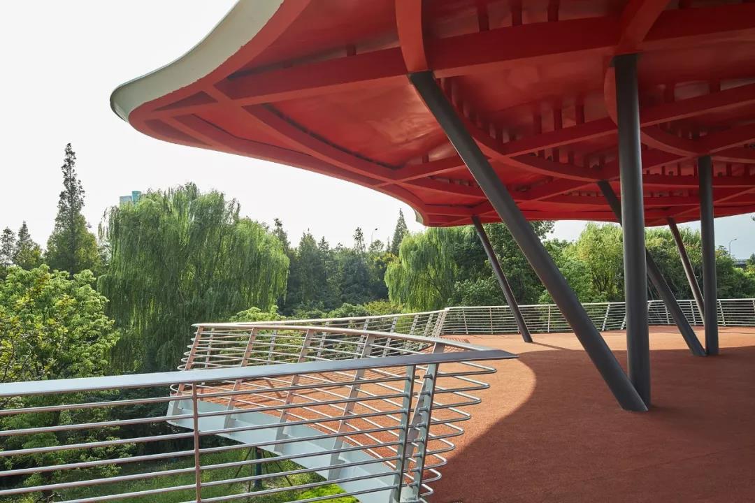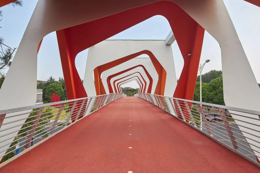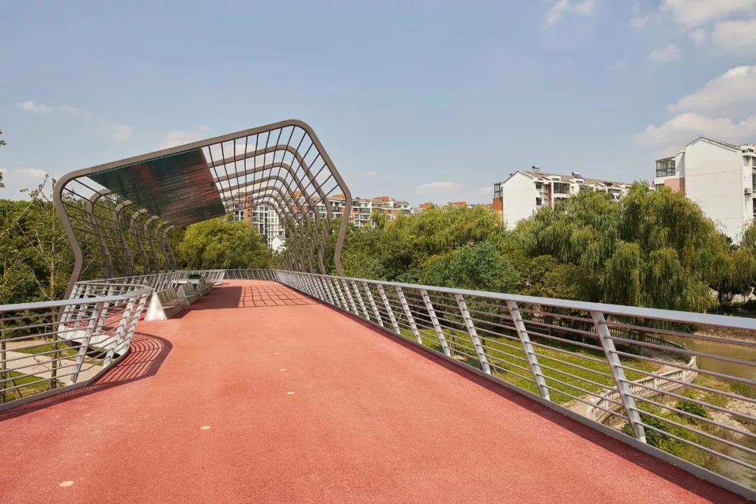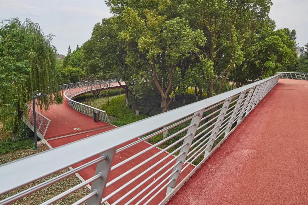采用全鋼結構設計以及彩色瀝青混凝土鋪裝;綠道作預制處理,具有維修費用低,耐磨等優點。