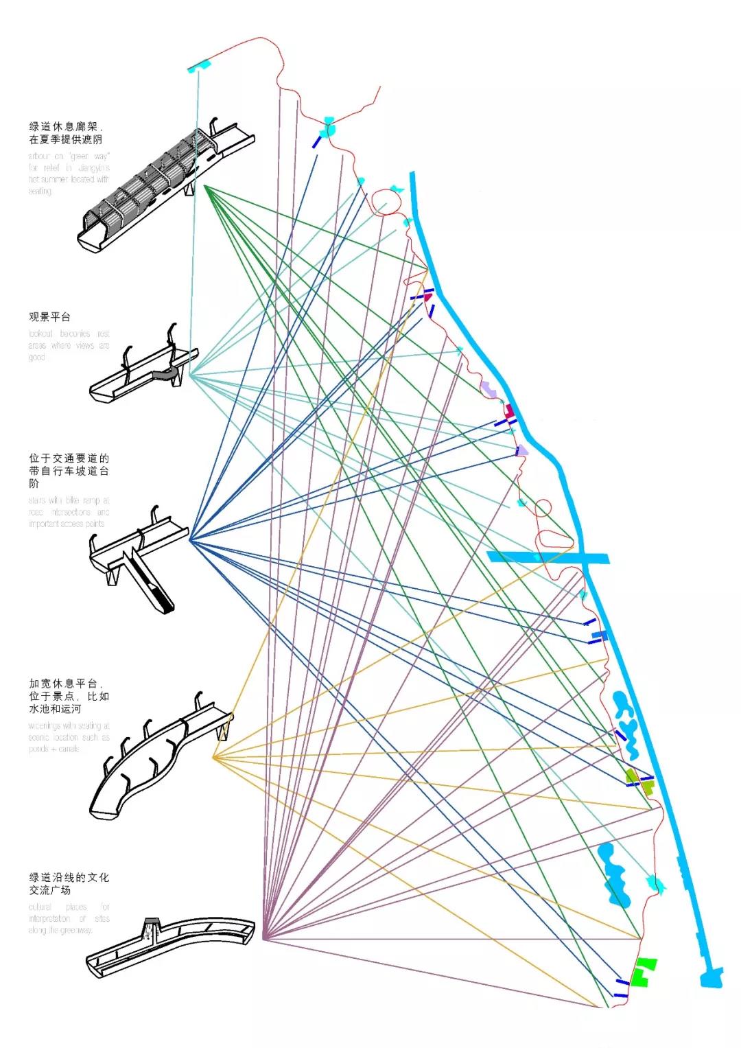 另外,在重要地段,設計增添了一些附屬設施。圍護結構詮釋了如何因地制宜地利用比鄰的既有道路與人行步道系統及新建綠道的地理優勢。附屬設施有助于完善景點裝備,使重要地段更具活力,綠道更加安全與人性化。此外,商業項目的租賃使用有利于降低綠道運營成本。擬建項目包括:兼具銷售與修理功能的自行車驛站;咖啡吧-酒吧-餐館;商店;健身館,等等。
