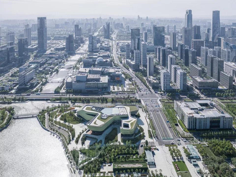 ▼展覽館鳥瞰圖,在城市新區(qū)內(nèi)創(chuàng)造出一個引人入勝的公共空間