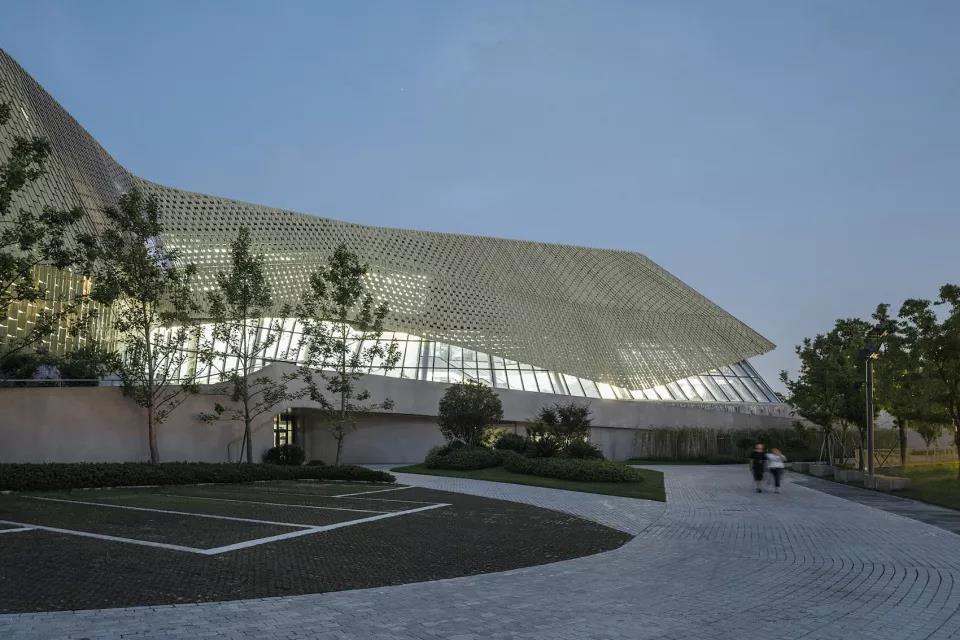 ▼夜幕中的展覽館,光線從建筑表皮的縫隙中漫出,整個展覽館都被籠罩在淡淡的光暈之下