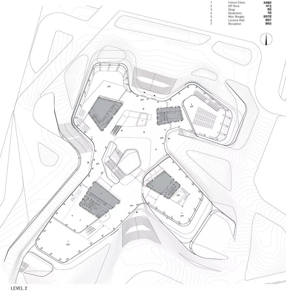 展館的二層設(shè)置著四個主入口,每個主入口都直接通向中央中庭。參觀流線從頂層開始,順著中庭周圍的坡道系統(tǒng)一路向下。值得一提的是,這個流線來源于空間序列的自然流動,并沒有明確的邊界,因而給人一種與室外景觀相似的自然連續(xù)感。參觀者如同居民在城市中生活一般地在展館中探索發(fā)現(xiàn)。他們可以自由地穿梭于室內(nèi)外展覽空間、休息區(qū)和景觀平臺之間,在觀展的同時欣賞新建的城市環(huán)境。