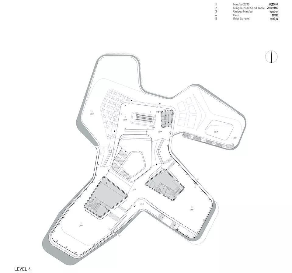 展覽空間主要位于展館的三層和四層。一二兩層容納著各種公共空間如餐廳、圖書館、閱覽區(qū)、一系列聚會區(qū)、兒童教育空間和游樂場、教室以及大型的多功能活動廳等。展館的屋頂上設(shè)置著一間咖啡廳,游客們可以在此放松身心、欣賞周邊的城市景色。
