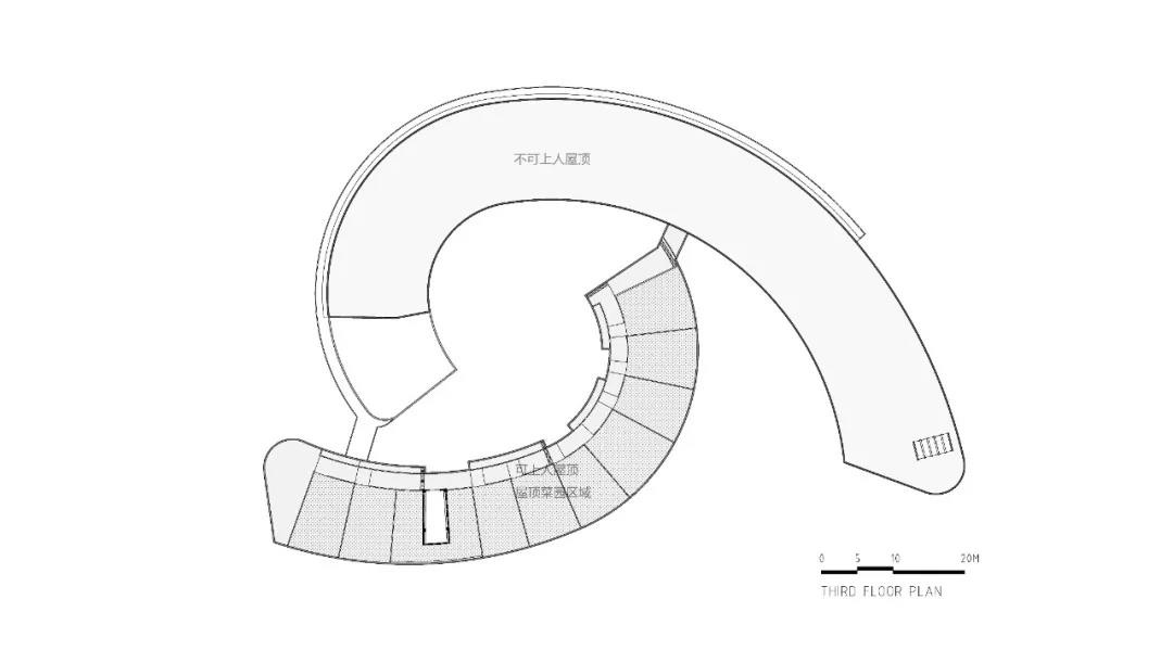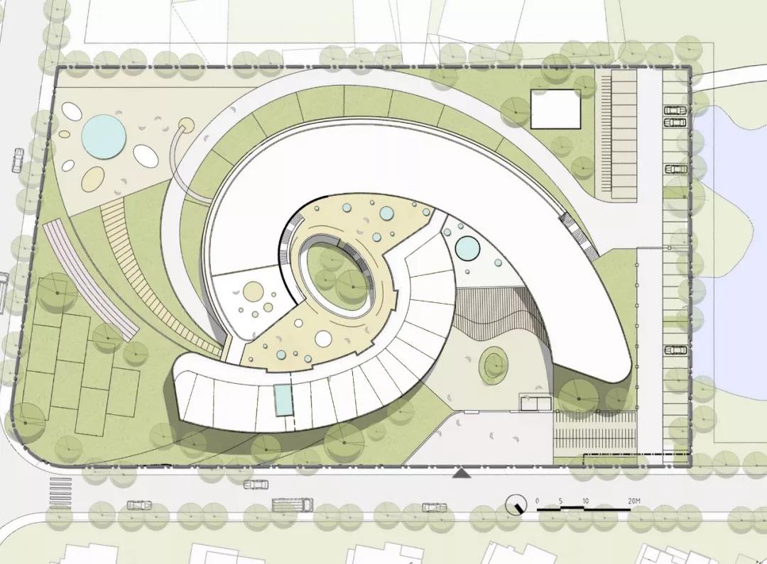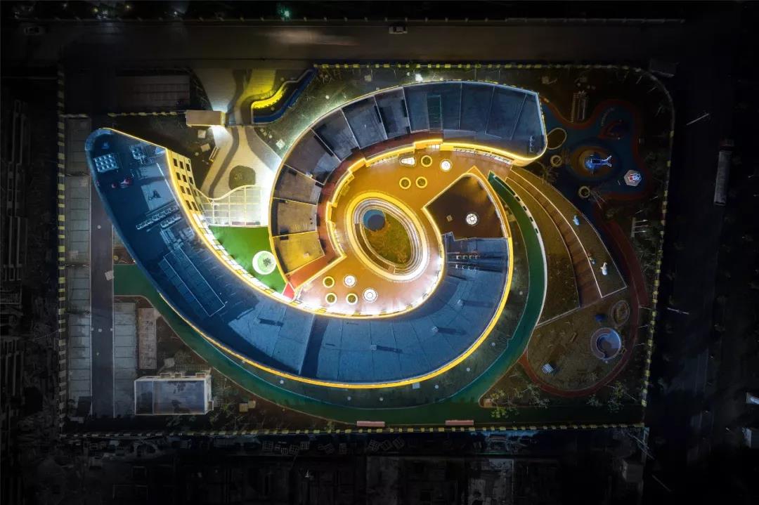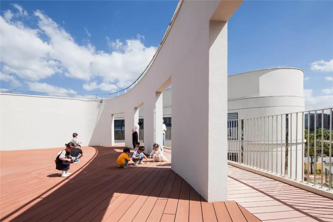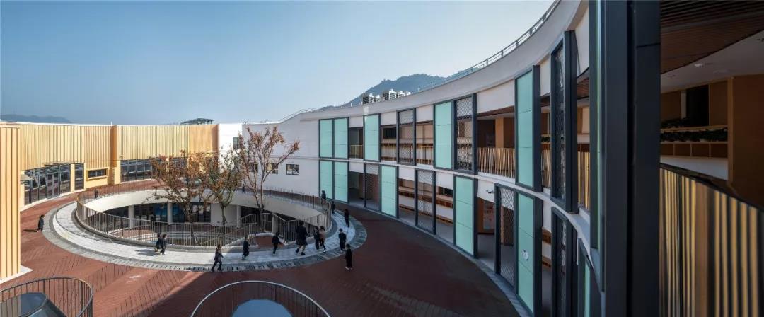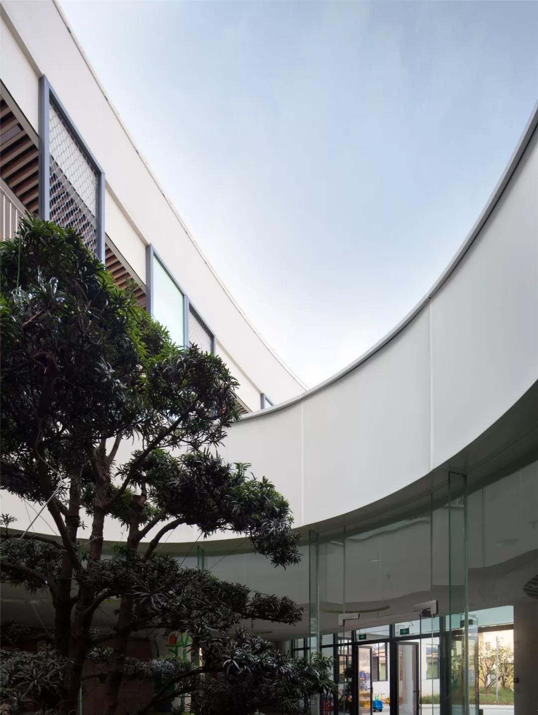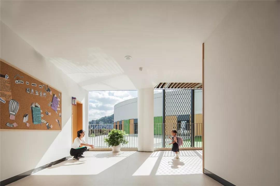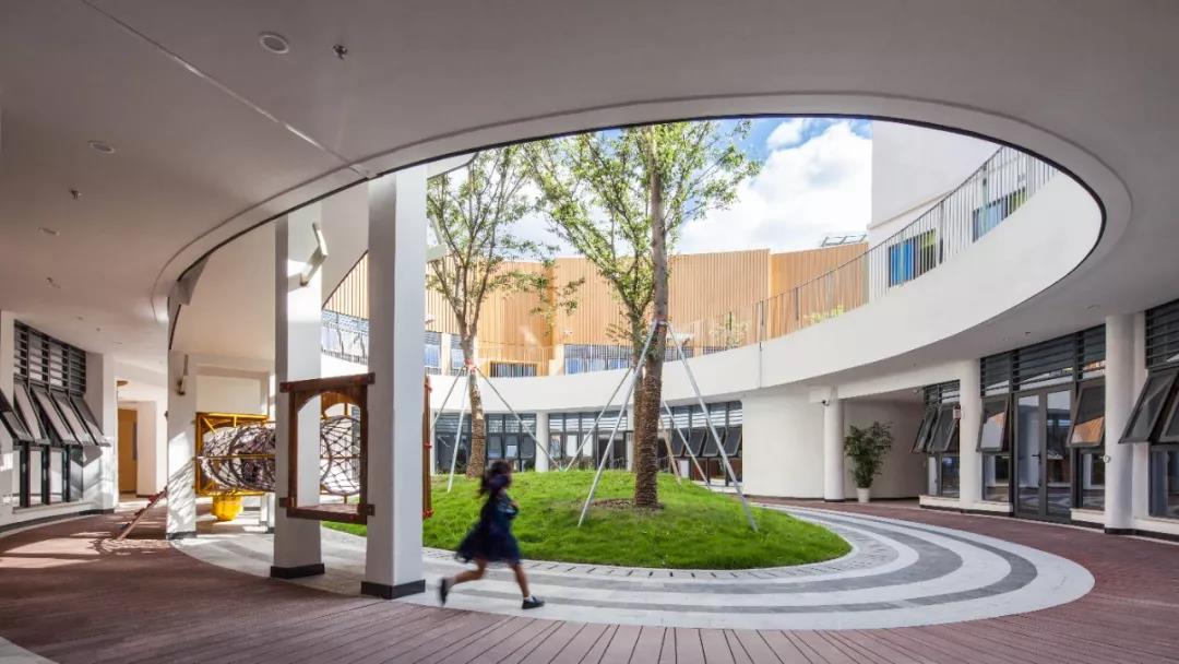 沿著入口的,是弧線形的安全路徑,孩子沿著明亮流暢的中庭肆意奔跑,便進入了擁抱聚合的“核心”——中央庭院中。這是一個橢圓形的中庭空間,抬頭便能望見天空,呼吸自然空氣。庭院由環(huán)繞走廊相連,為半室外的空間,室內外的界限在此消隱,而“藏”在分隔墻之后的,是孩子們的教室。它們被很好的包裹在了海螺的擁抱中,在自在的環(huán)境下學習成長。