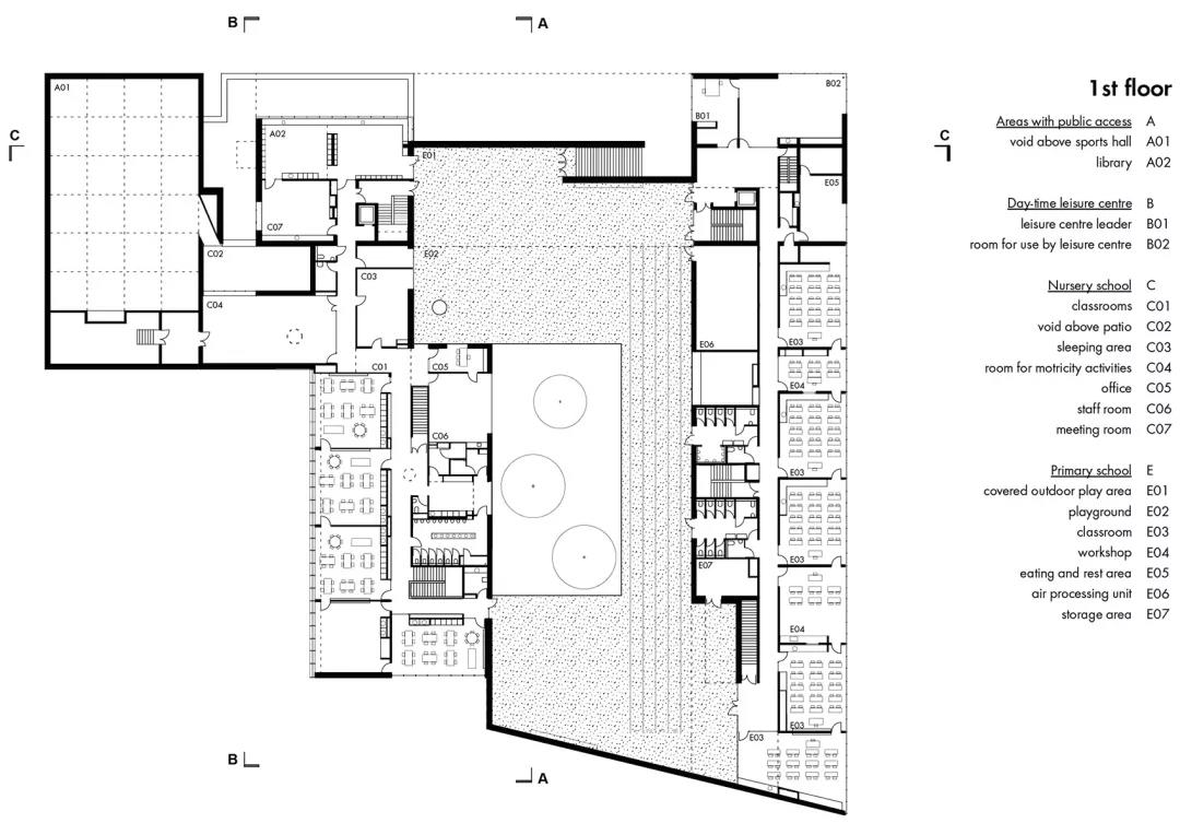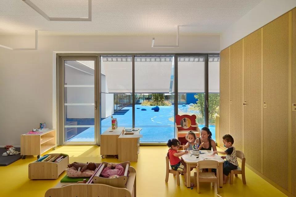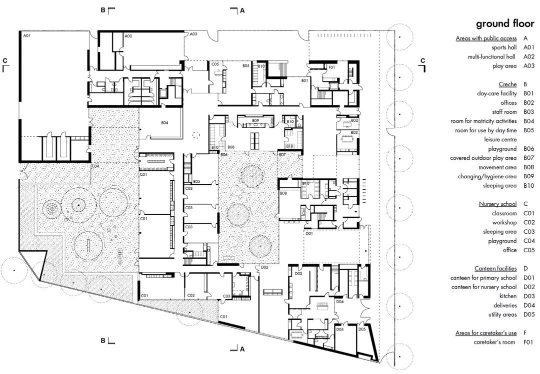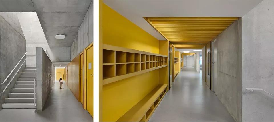 首層空間容納了育嬰室、體育館和幼兒園。小學設置在二層,學生們在進校之前需要先經由寬闊的樓梯行至上方樓層的庭院區域。