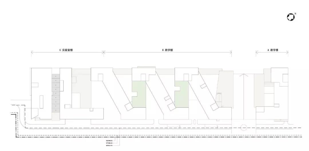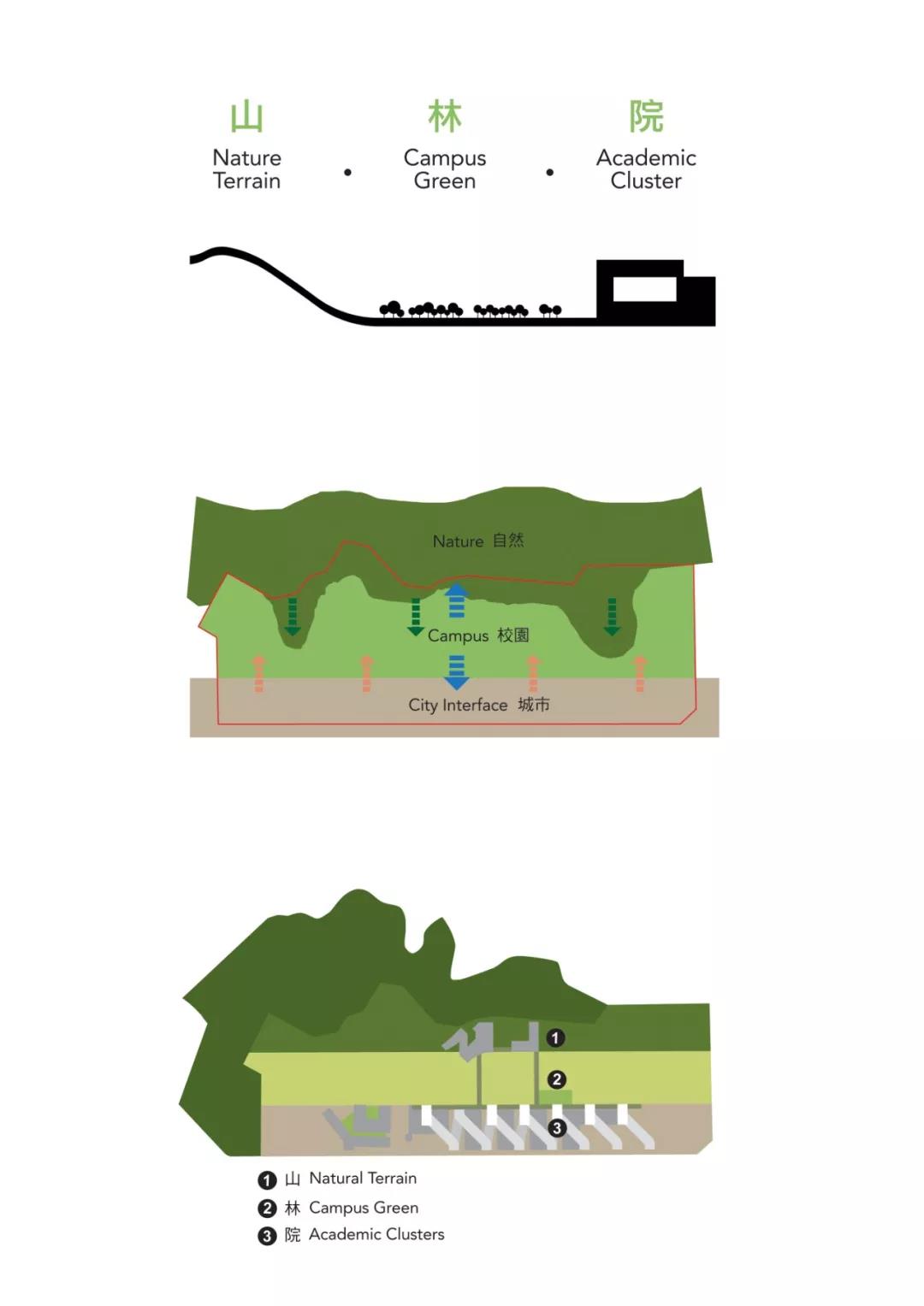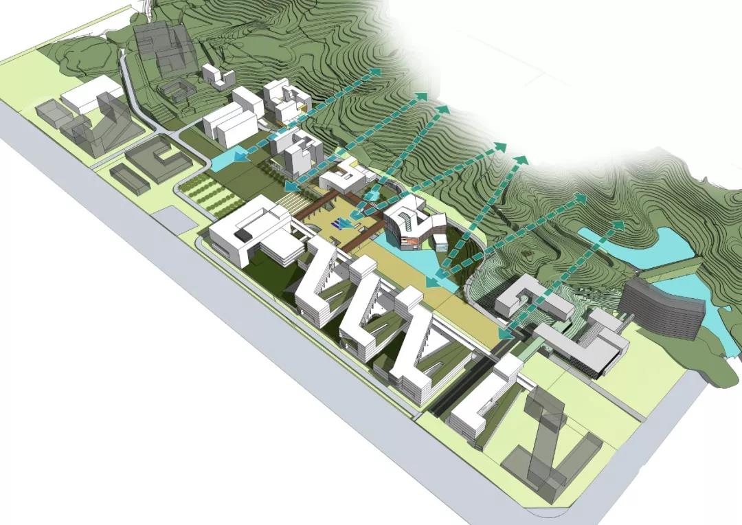 該項目以現(xiàn)有自然景觀作為主要規(guī)劃前提,為了充分利用其自然資源并最大限度地發(fā)揮場地功能,該校園分為三個區(qū)域:建筑與地形相融合的自然地形區(qū),位于城市邊緣的學(xué)術(shù)集群區(qū)以及在兩者之間綠色校園區(qū),它擁有一個休閑互動的中央開放空間。