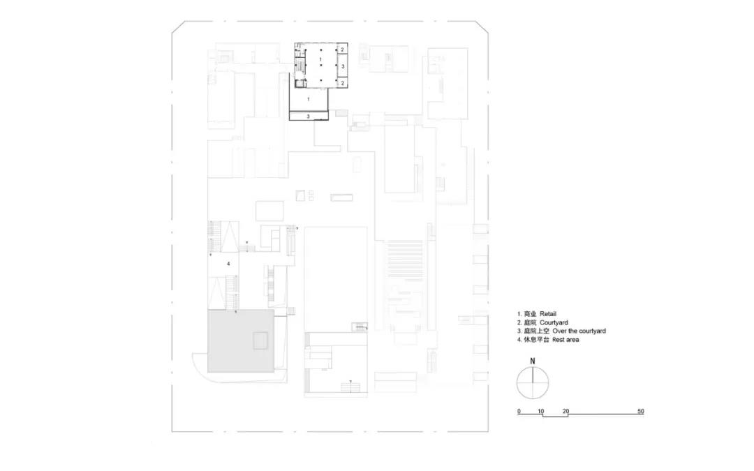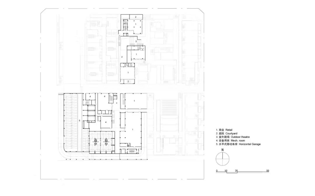 三明治式的疊加模式同樣運用在創意辦公區。 公園作為上表面, 而下沉的采光井和街道形成下表面。辦公空間打破傳統的核心筒模式,由一系列帶私家院落的辦公盒子疊加而成。在它們的縫隙交錯間,形成社交空間與街巷體驗。這些社交空間包括公園、內部院落、景觀平臺、街道騎樓、下沉庭院、和洞穴劇場。
