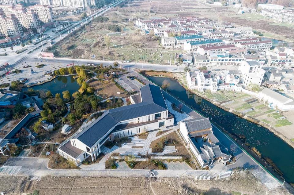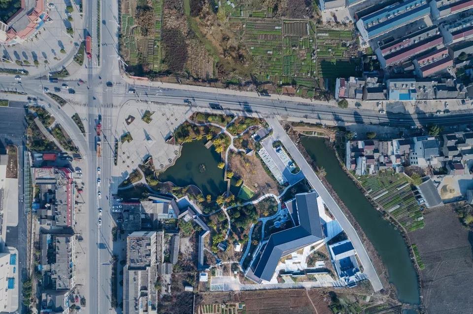 ▼主館東側(cè)鳥瞰,在建筑形態(tài)上提煉了“之”游動(dòng)的形態(tài),結(jié)合坡屋頂?shù)奶卣?/span>