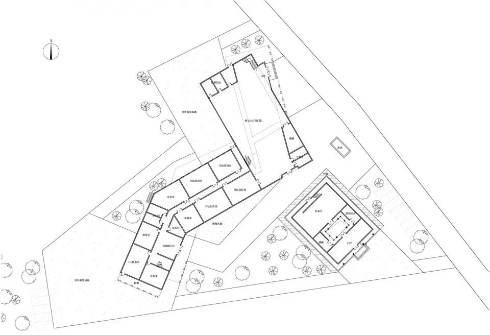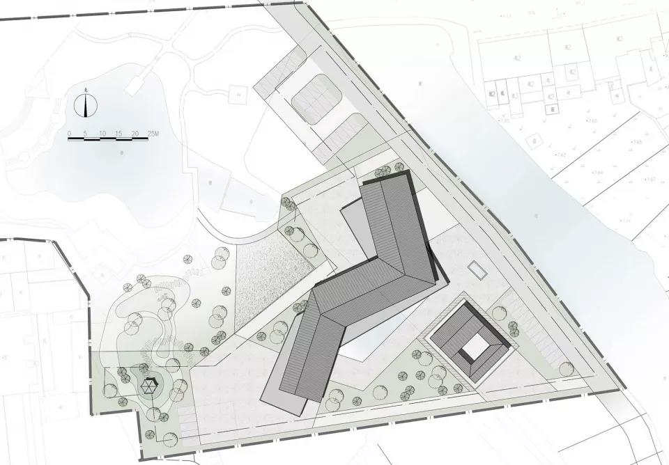 總體布局以中國(guó)傳統(tǒng)書畫為原型,提取詩(shī)、書、畫、印四個(gè)主要構(gòu)成元素,將公園與廣場(chǎng)視作“畫”,以林散之書畫院作為“詩(shī)”,選取了其名字中的“之”為載體,用“書法”的形式表現(xiàn)出來(lái),而方正的九牧堂又恰好可擬作“印”,同其他三個(gè)元素構(gòu)成完整的一幅古典長(zhǎng)卷。