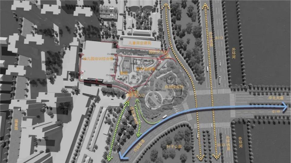 ▼鳥(niǎo)瞰局部,整個(gè)幼兒園室外只使用了藍(lán)、黃、橙三種顏色