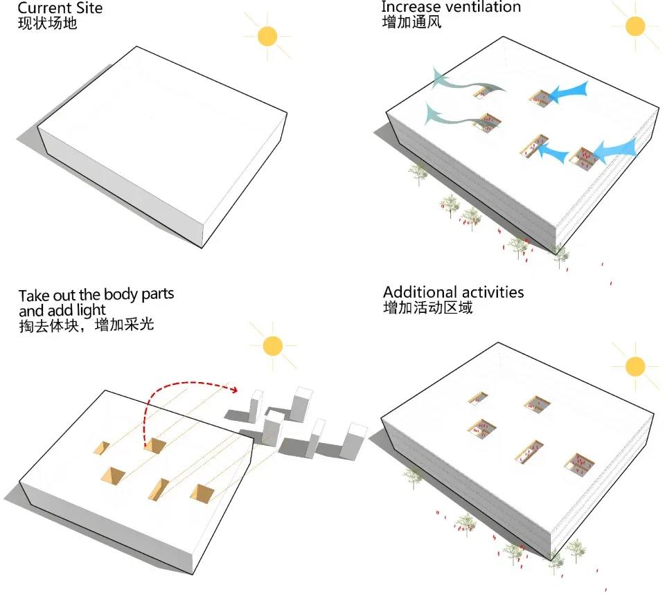 此園所是基于現(xiàn)有的建筑物改造而成,由一個(gè)進(jìn)出口貿(mào)易中心改造而來(lái) —— 擁有清晰的規(guī)劃結(jié)構(gòu),簡(jiǎn)單的建筑外觀,起初處于廢墟狀態(tài)。 經(jīng)過(guò)漫長(zhǎng)的實(shí)地勘察、測(cè)繪,等諸多信息,我們?cè)噲D呈現(xiàn)打破邊界,將自然的元素以一種非自然的形式表達(dá),嘗試尋找關(guān)于此幼兒園的無(wú)限可能。