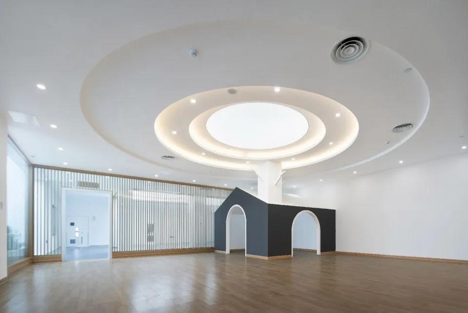 每一個(gè)窗子都代表了一個(gè)夢(mèng),此幼兒園的建筑外形,通過(guò)大大小小的、高高低低的窗子布局、讓一道道陽(yáng)光透過(guò)窗子打進(jìn)來(lái),與大廳內(nèi)象征太陽(yáng)的造型設(shè)計(jì)遙相呼應(yīng),相得益彰,當(dāng)孩子們站在樓頂俯瞰,建筑、人文、自然、都以不規(guī)則的多變形區(qū)域呈現(xiàn),互相分離又緊密相依,這也是一所孩子們的精神棲所。