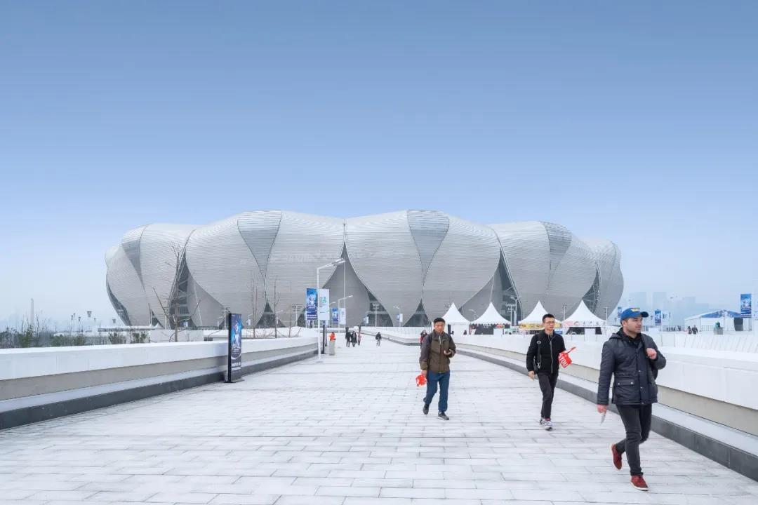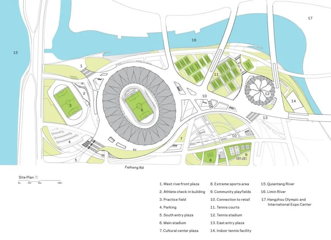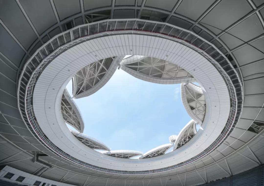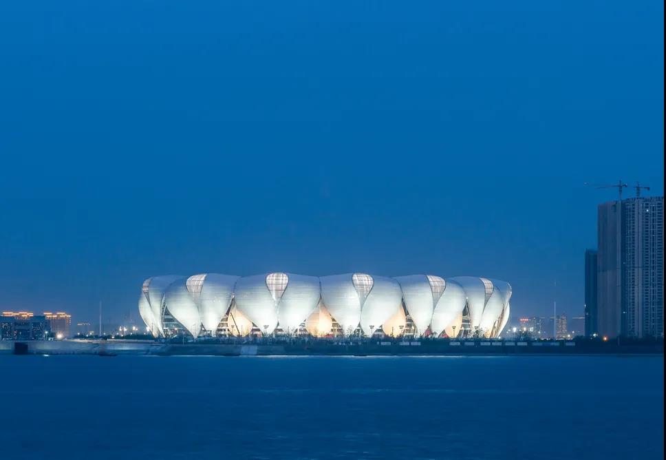 主體的運動場館以西湖的睡蓮花瓣為靈感,大花瓣和28片小花瓣纏繞在一起打造了杭州體育館的鋼結構,比北京國家體育場(俗稱“鳥巢”)少用了三分之二的鋼材,具有極高的可持續性。體育中心包括一個可容納8萬個座位的主體育場以及一個可容納1萬個座位的網球場。在這兩個體育場的開發中,團隊使用了參數化設計來節省資源,使球迷們更接近場地,并讓座位盡可能地保持開闊,以便欣賞錢塘江的景色。