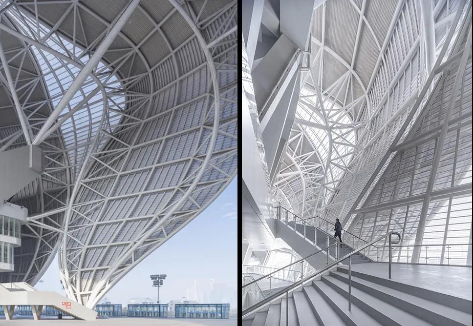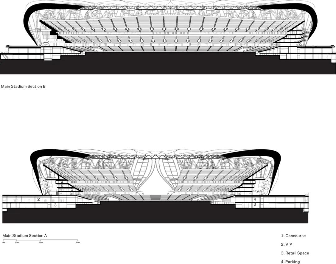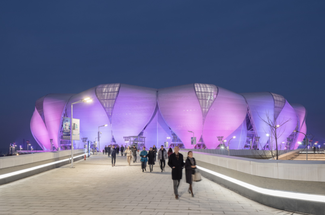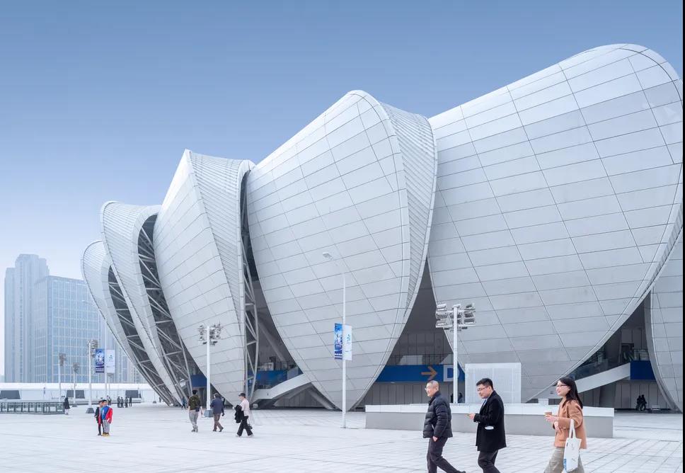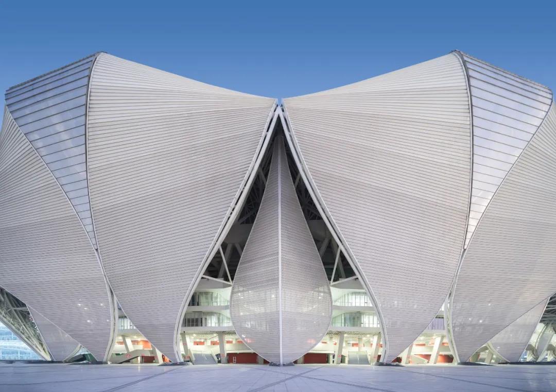 主體的運動場館以西湖的睡蓮花瓣為靈感,大花瓣和28片小花瓣纏繞在一起打造了杭州體育館的鋼結構,比北京國家體育場(俗稱“鳥巢”)少用了三分之二的鋼材,具有極高的可持續性。體育中心包括一個可容納8萬個座位的主體育場以及一個可容納1萬個座位的網球場。在這兩個體育場的開發中,團隊使用了參數化設計來節省資源,使球迷們更接近場地,并讓座位盡可能地保持開闊,以便欣賞錢塘江的景色。