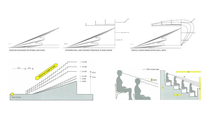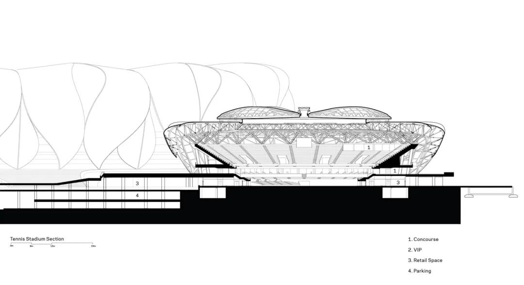 在場地中,NBBJ優先考慮了環境可持續性和公眾可達性。場地平面由三層網絡構成:首先,地上平臺命名為“體育大道”,連接規劃項目如主體育館和網球公開賽設施,形成城市道路網絡。首層,平臺,小徑、花園和廣場構成了一個公共休閑活動區域,為另類和極限運動,形成公共城市空間網絡。底層,下沉式空間和庭院通往大的地下商場,包括精品商店、餐廳和一個多功能電影院,形成商業空間網絡。