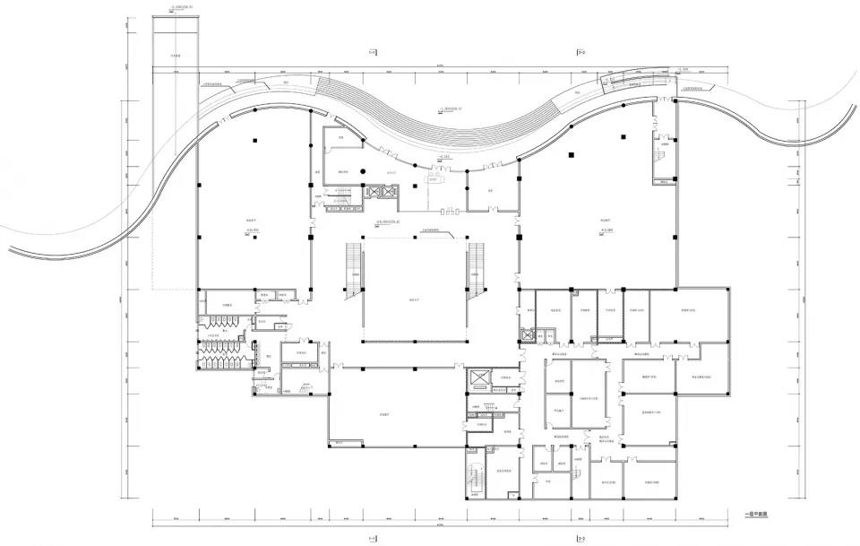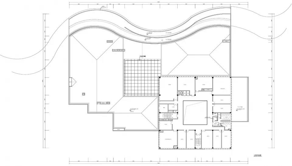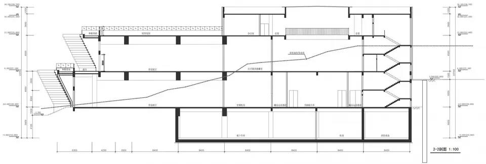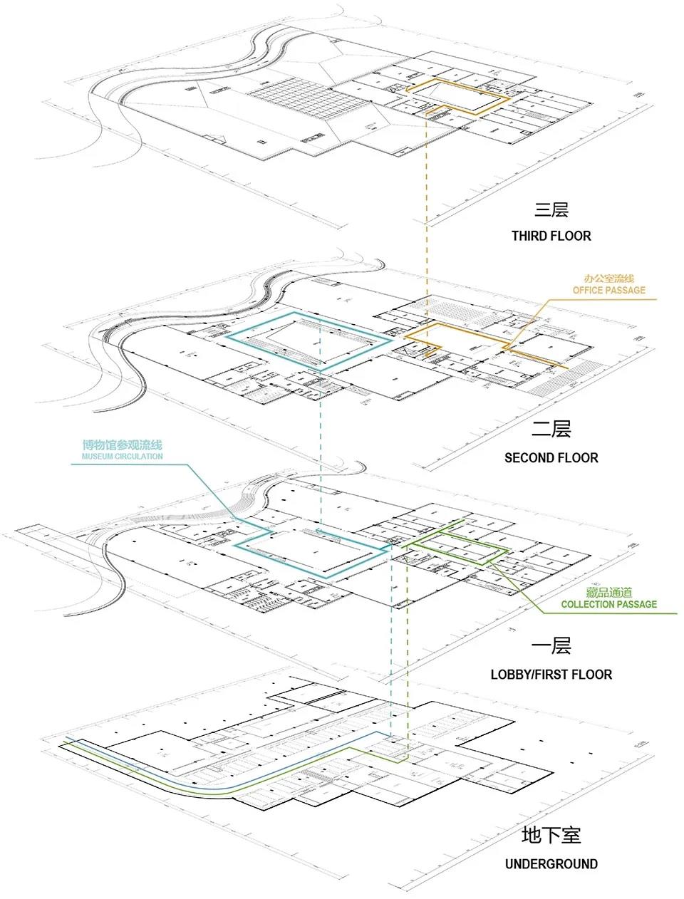 游客進入建筑內(nèi)部最先到達的空間是展覽中心的大廳,兩層通高12米中軸對稱的中庭設(shè)計為整個建筑的空間核心。首層兩個常設(shè)展廳和一個臨時展廳圍繞中庭廳布置,通過直通二層的樓梯連接布局相同的二層展廳。為考慮觀眾參觀路線的便捷性和流暢性,避免參觀路線的的折返和重復(fù),各個展廳出入口獨立設(shè)置并與其他功能區(qū)有效銜接。展廳東南部分為藏品區(qū),設(shè)置有石器、瓷器、陶器、金屬類、瑪瑙、錢幣、書畫、革命文物等八大類藏品庫房,保持恒濕以利于藏品的長久安全的存放。藏品流線完全獨立,所以如有新藏品入館會在地下的卸貨平臺完成裝卸并通過專用通道及貨梯進入展館以確保藏品的安全。辦公區(qū)垂直藏品區(qū)設(shè)立,在建筑南側(cè)消防環(huán)道有獨立的出入口,有效利用了南側(cè)順應(yīng)山勢的消防道路。