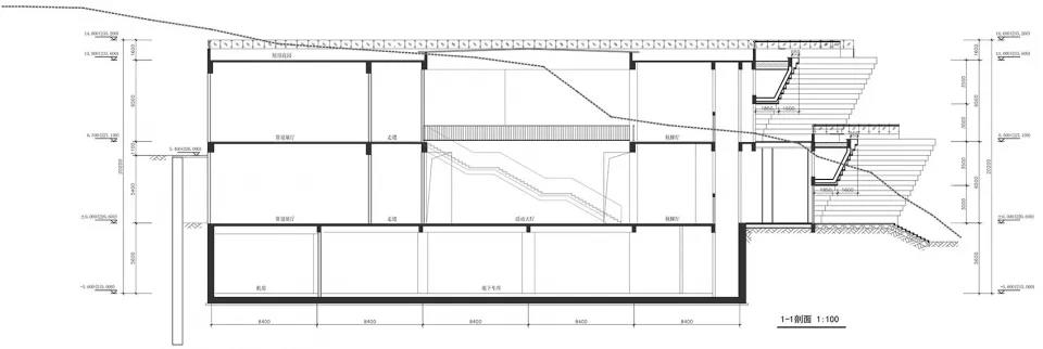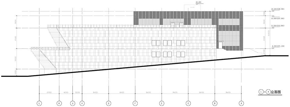 ▼展示中心正立面外觀,結(jié)合實際的蜿蜒的基地山形,形成景觀山地建筑
