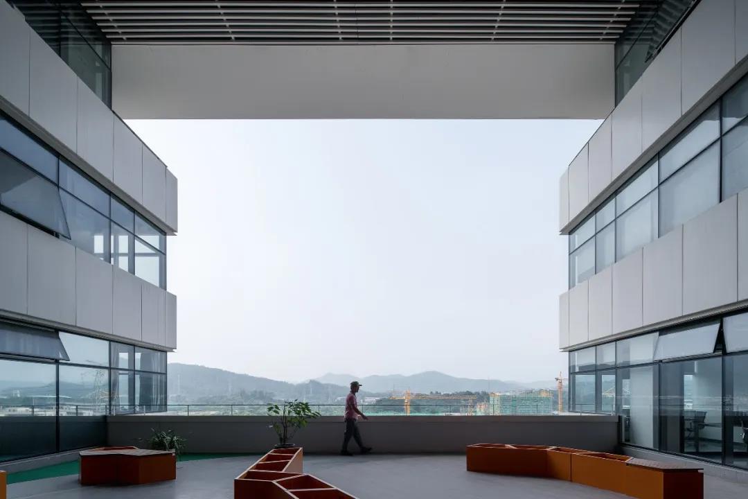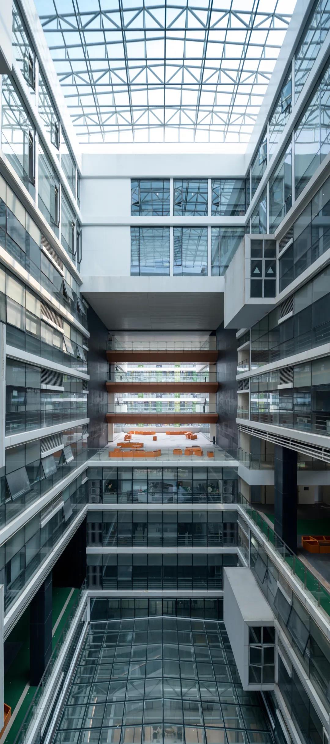 為了在高層建筑中實現類似低層廠房建筑的街道公共空間,我們打開建筑的“核心”,把一個“大核”拆解成幾個“小核”,讓建筑原本的“實心”變成“空心”,有更大的空間撐滿可建設用地,樓板圍繞四個核心筒像搭積木一樣展開,并在頂層預留了未來企業擴展的空間(后續也確實被入駐企業改造擴建了)。