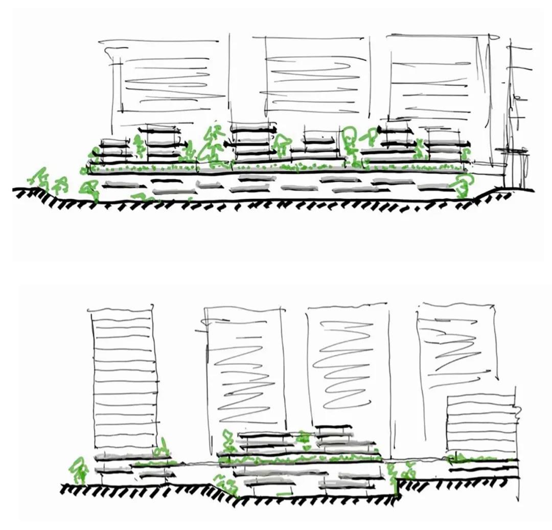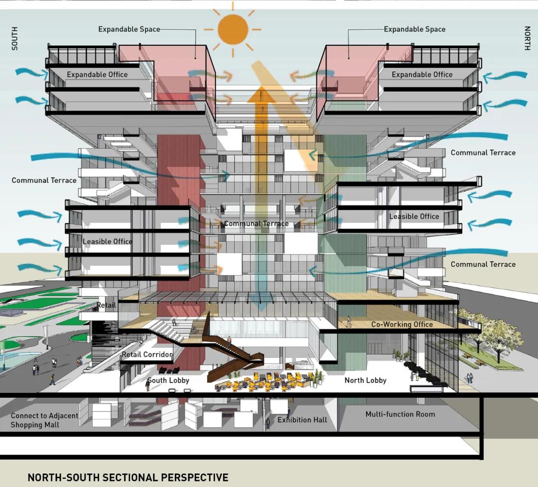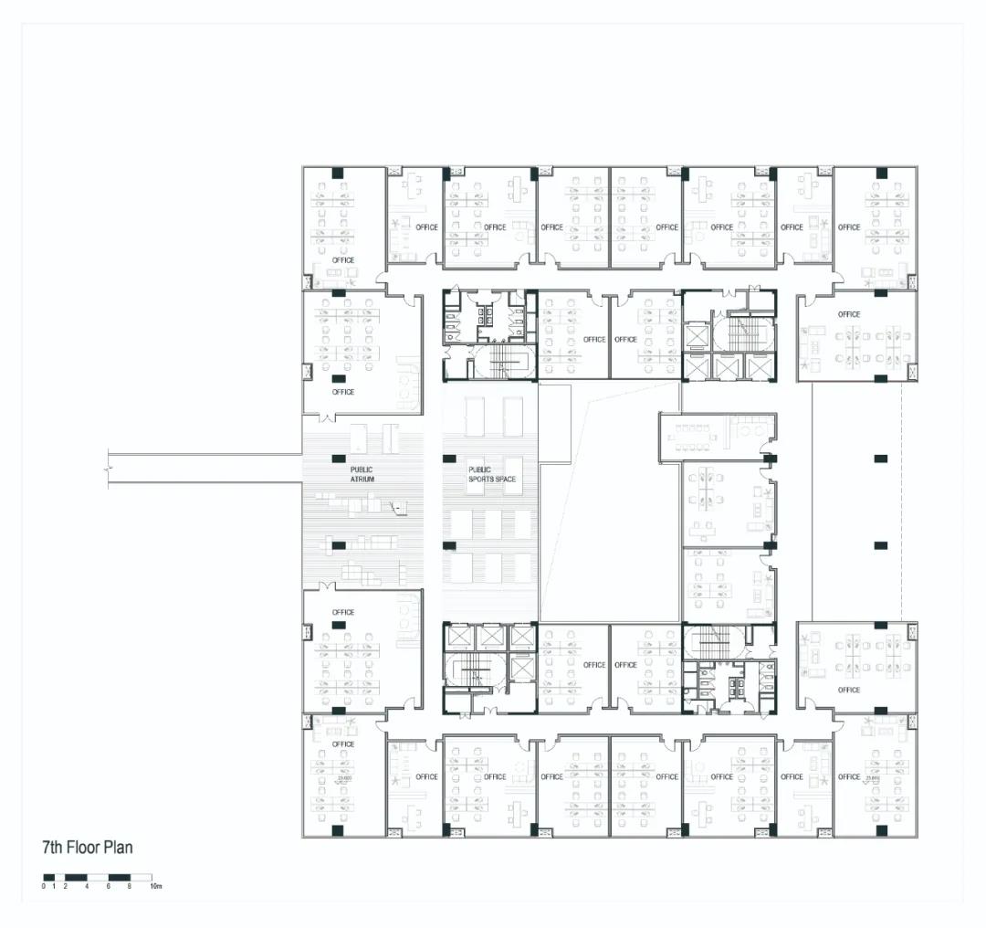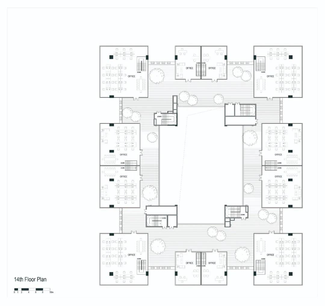 原本單調孤立的樓板產生了空間關系,低層建筑的街道公共空間出現在高層的結構中,同時,內側的辦公空間也有自然采光和通風,各層大平層均可雙側采光,這里辦公的人,也有機會看到彼此,提升了場所認同感。