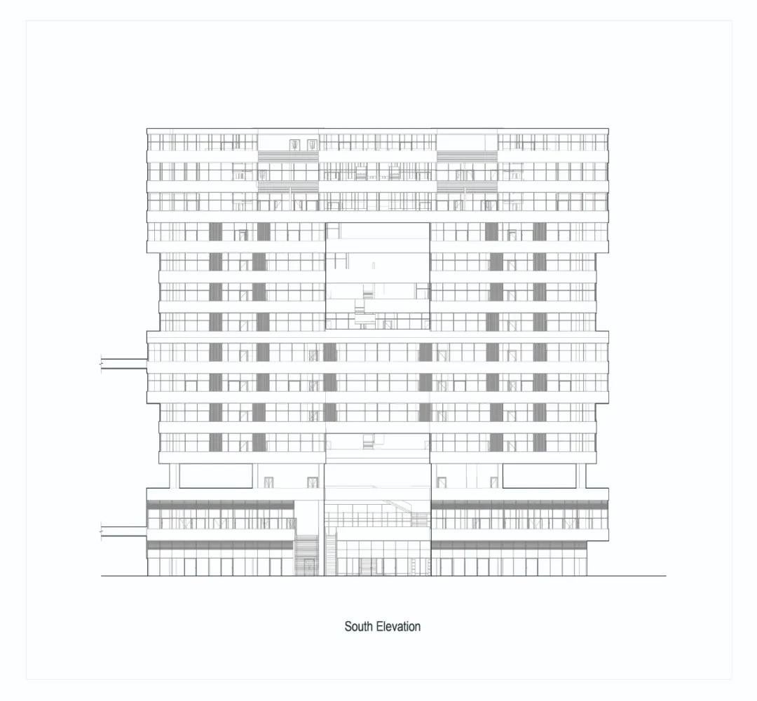 設計按照每三層共享一個大平臺的空間邏輯,隨著樓層的變化,依次在四個面的不通高度位置出現。我們在方案擴初階段采用ArchiCAD的BIM建模型方式,全部外墻圖紙由三維模型直接導出成圖,所有空調室外機以及頂板等二次結構一體澆筑成形。